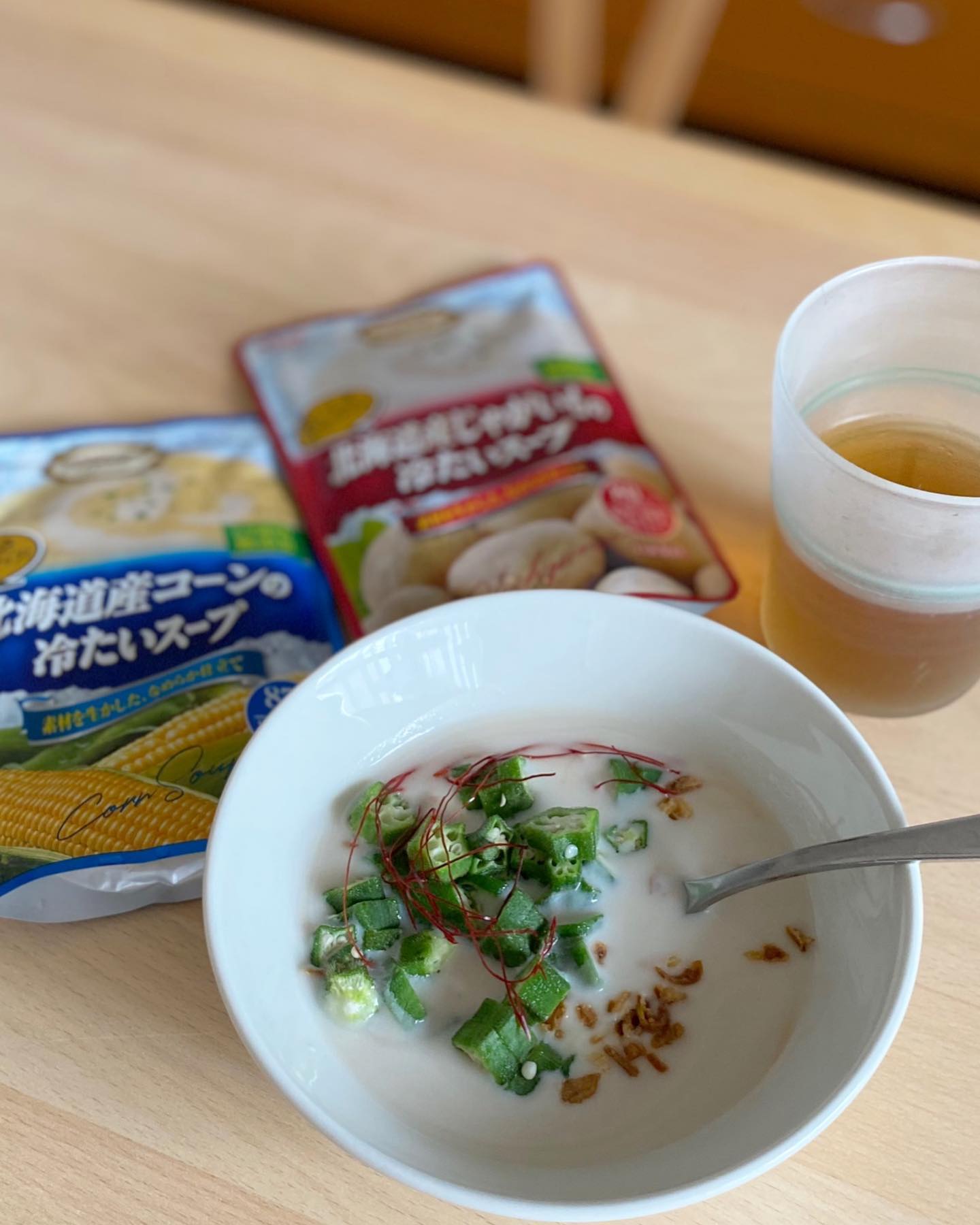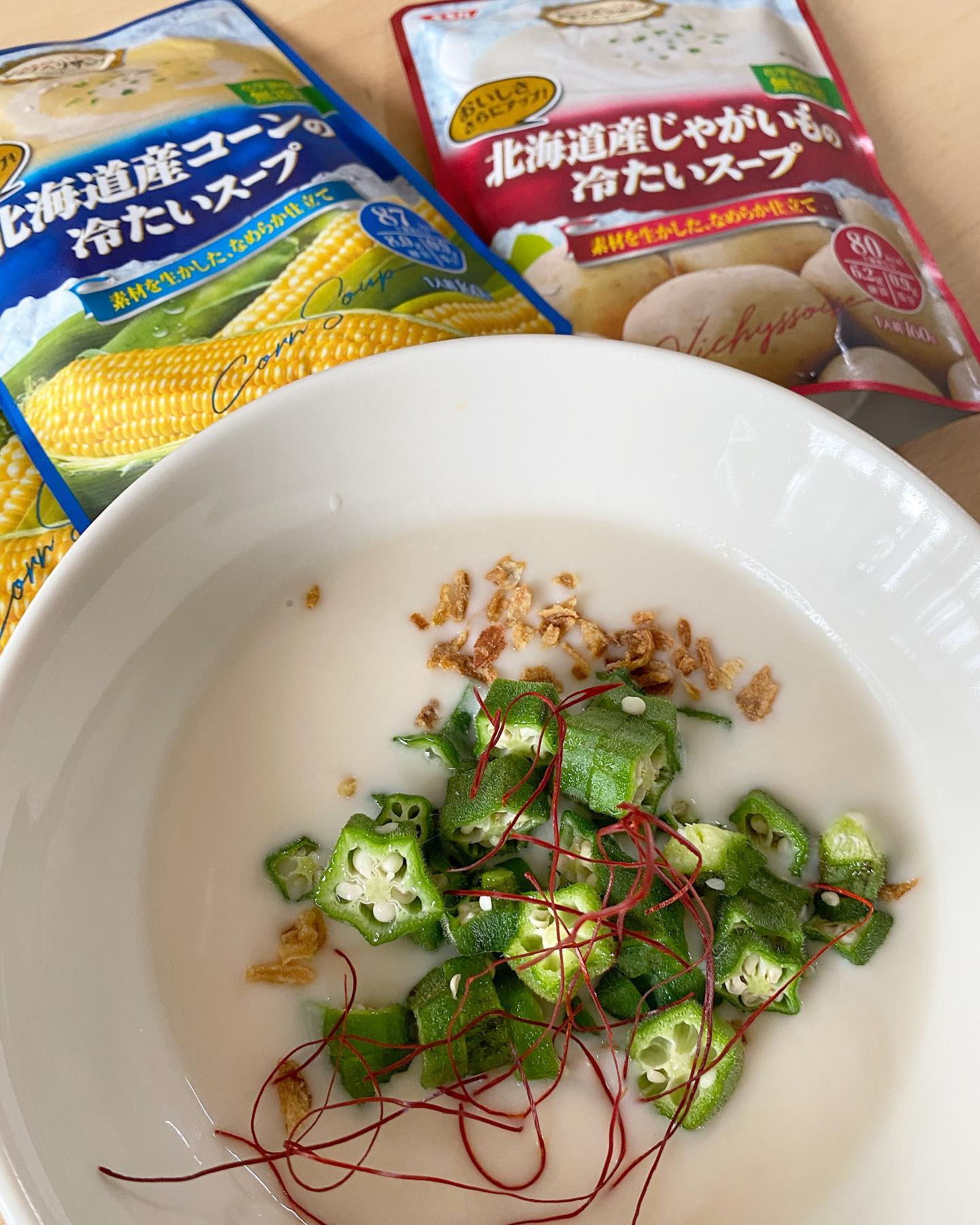 清水食品さん シェフズリザーブ ✅北海道産コーンの冷たいスープ ✅北海道産じゃがいもの冷たいスープ シェフズリザーブ 冷たいスープシリーズは 国産野菜をメインに、 国内工場で作られた 化学調味料無添加のスープです😊 野菜のフレッシュ感や 香りがそのままパックに 閉じ込められています✨ 暑い時のごはんに 冷たいスープ🍸 冷蔵庫にある野菜をレンチンして 冷やして入れると ボリューム、そして栄養価もアップ✨ 食欲がない時にも良さそうです! ラー油をプラスしてもよかったな〜 色々アレンジできそうです #PR #清水食品 #SSK #清水食品 #シェフズリザーブ #冷たいスープ #monipla #ssk_fan #モニプラ #モニプラファンブログ #おうちごはん #朝ごはん #お昼ごはん #レトルト #レトルト食品 #夏ごはん #オクラ #夏野菜 #簡単ごはん #簡単レシピ #簡単アレンジ #ビシソワーズ