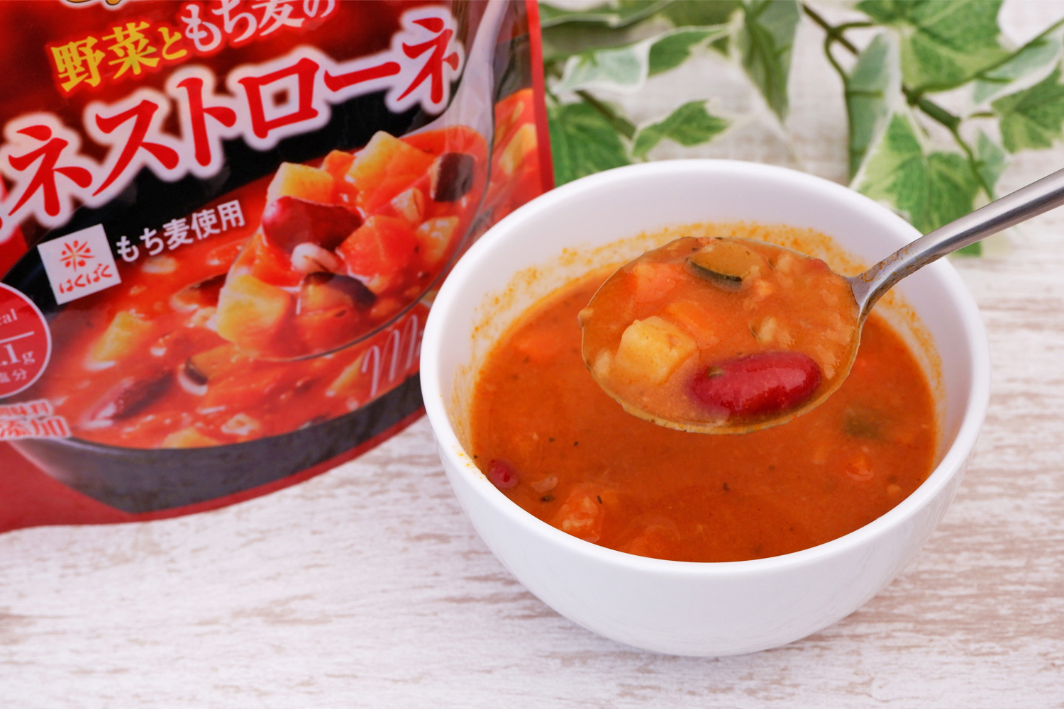 今回は『野菜ともち麦のミネストローネ』を使ったアレンジレシピを
