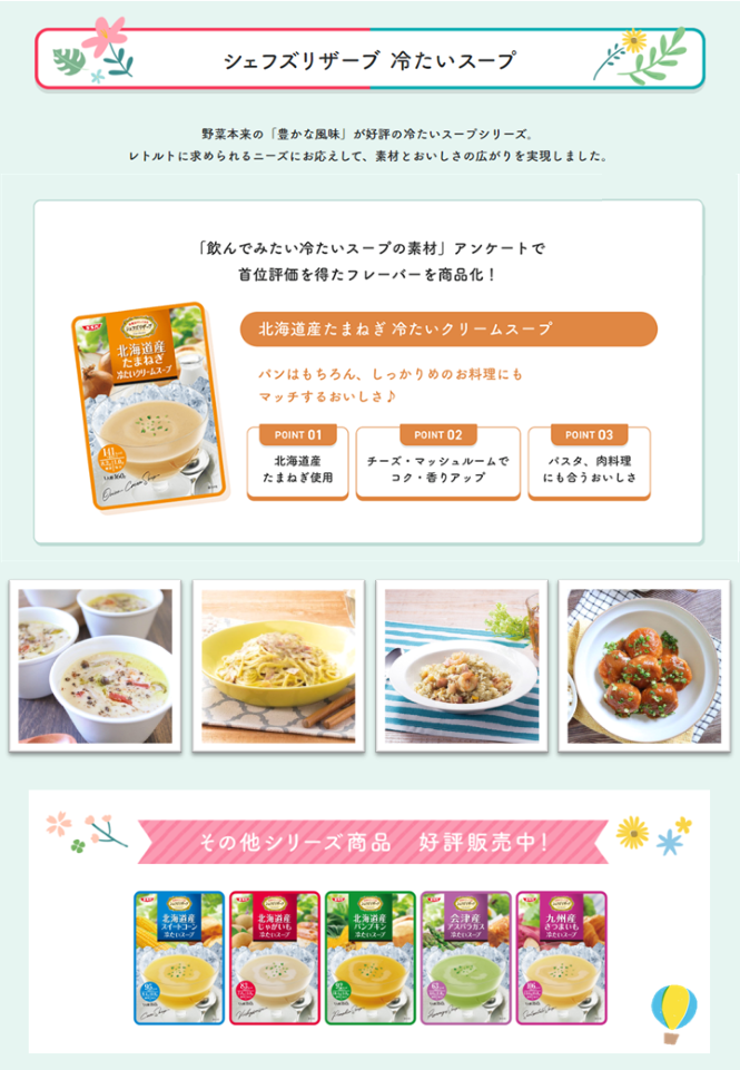 「本格レストランのおいしさを味わえるレトルトスープ」、「こだわりの原料を使用した水産・デザート缶詰」など、簡単便利でおいしく生活をサポートする商品を製造・販売しております。