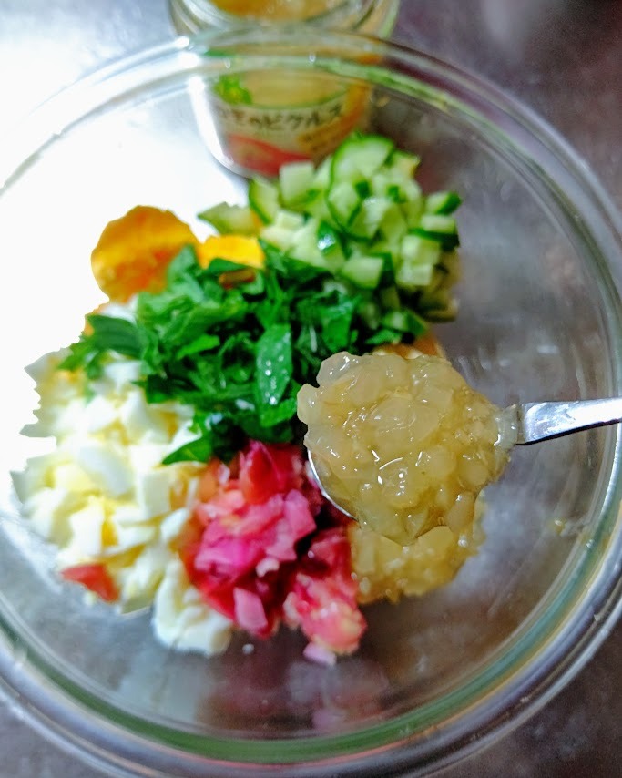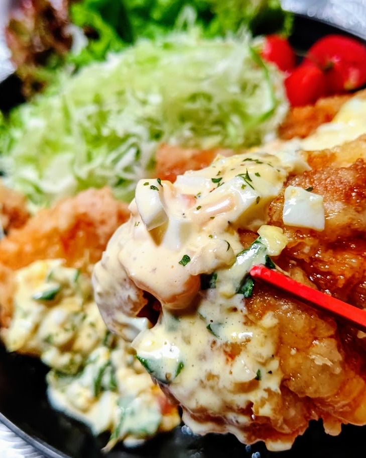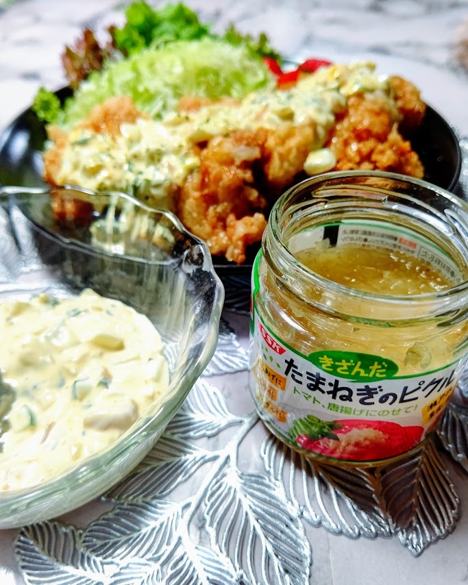. 清水食品株式会社さまの秋冬新商品【きざんだたまねぎのピクルス(瀬戸内レモン入り)】をお試ししました。 きざんだたまねぎに瀬戸内レモンの果汁と果皮を加えた、香り爽やかなピクルスだそうで、単独で食べてみましたところ、レモンの酸っぱさを感じますが優しく、玉ねぎの持つ甘さ、シャキシャキ感、レモンの爽やかな味と酸味を味わいました。 これを王道のタルタルソースに使おうと昨夜はチキン南蛮を作りました。 バッター液から片栗粉をまぶして2度揚げしました。 ザクザク感を味わうため甘酢タレは浸けず、タルタルソースと共に上からかけました。 タルタルソースは、マヨネーズ、ゆで卵、たまねぎのピクルス、きゅうり、大葉、家で作ったみょうがの甘酢漬けが入っています。 甘味もあって、とっても美味しいソースとなりました💕 あ~お腹いっぱい😋 ・ ・ ・ ・ ・ #PR #清水食品 #SSK #きざんだピクルス #きざんだたまねぎのピクルス #ピクルス #monipla #ssk_fan #おうちごはん #チキン南蛮 #タルタルソース