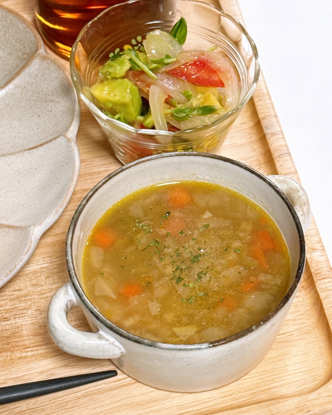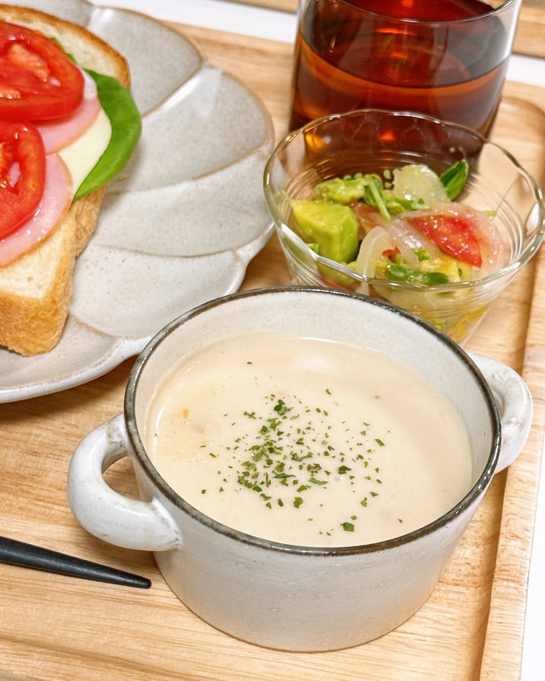 ︎𖡼.𖤣𖥧𖡼.𖤣𖥧⚘ “レンジで約1分”シリーズでスープを用意して パンプレートにしました🍞🥗 忙しい朝でもすぐできるし 具材感がちゃんとあって満足感◎✨ 今回食べてみたのはこの3種類👇 🥄 根菜と豆と大麦の白いミネストローネ 🥄 北海道産コーンのポタージュ 🥄 あさりのコクと旨みクラムチャウダー どれも電子レンジで温めるだけでOK📦 常温保存できるからストックしておくと すぐ食べれるからほんと助かる〜! 白いミネストローネは野菜とお豆がたっぷりで コーンポタージュは粒コーンがしっかり🌽 クラムチャウダーは旨みがぎゅっと濃厚🤍 スープってホッとする☺️ 朝ごはん・お昼・夜まで どのタイミングに食べてもいいね◎ ごちそうさまでした✨ ︎𖡼.𖤣𖥧𖡼.𖤣𖥧⚘ #PR #清水食品 #SSK #スープ #レンジ調理 #具沢山 #ごちそう #モニプラPR #monipla #ssk_fan