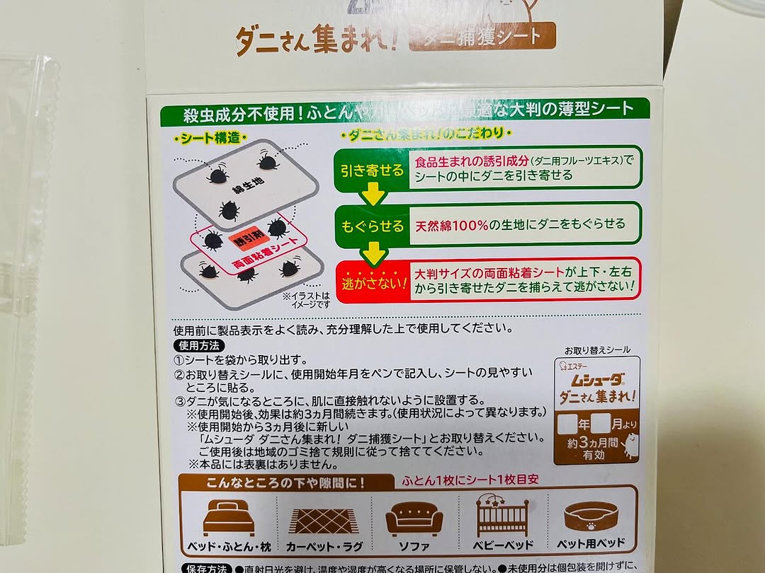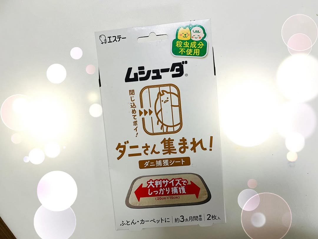ムシューダ ダニさん集まれ! ダニ捕獲シート こちらは、 殺虫成分不使用の大判捕護シートです! ☑️殺虫成分不使用で、食品成分でダニを誘引 ☑️子供やペットのいるご家庭でも使える! ☑️大判サイズの強力な両面粘着シートでダニをしっかり捕獲 ☑️ダニのフンや死骸もまとめて、シートごと捨てられる! 子どももいるので、特にベッドは、、気になってて。 これは、個包装で、大判! 日付シールを貼っておくだけ! 3ヶ月程有効なのでありがたい☺️! これからもたくさん使っていきます! #PR #エステー #ムシューダ #ダニさん集まれ #ダニ対策 #ダニ #ダニ捕獲シート #monipla #st_fan