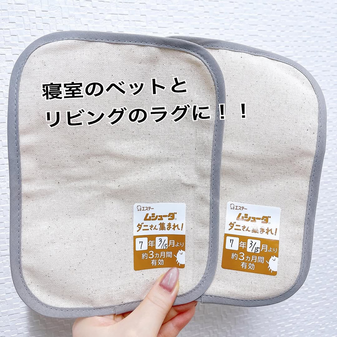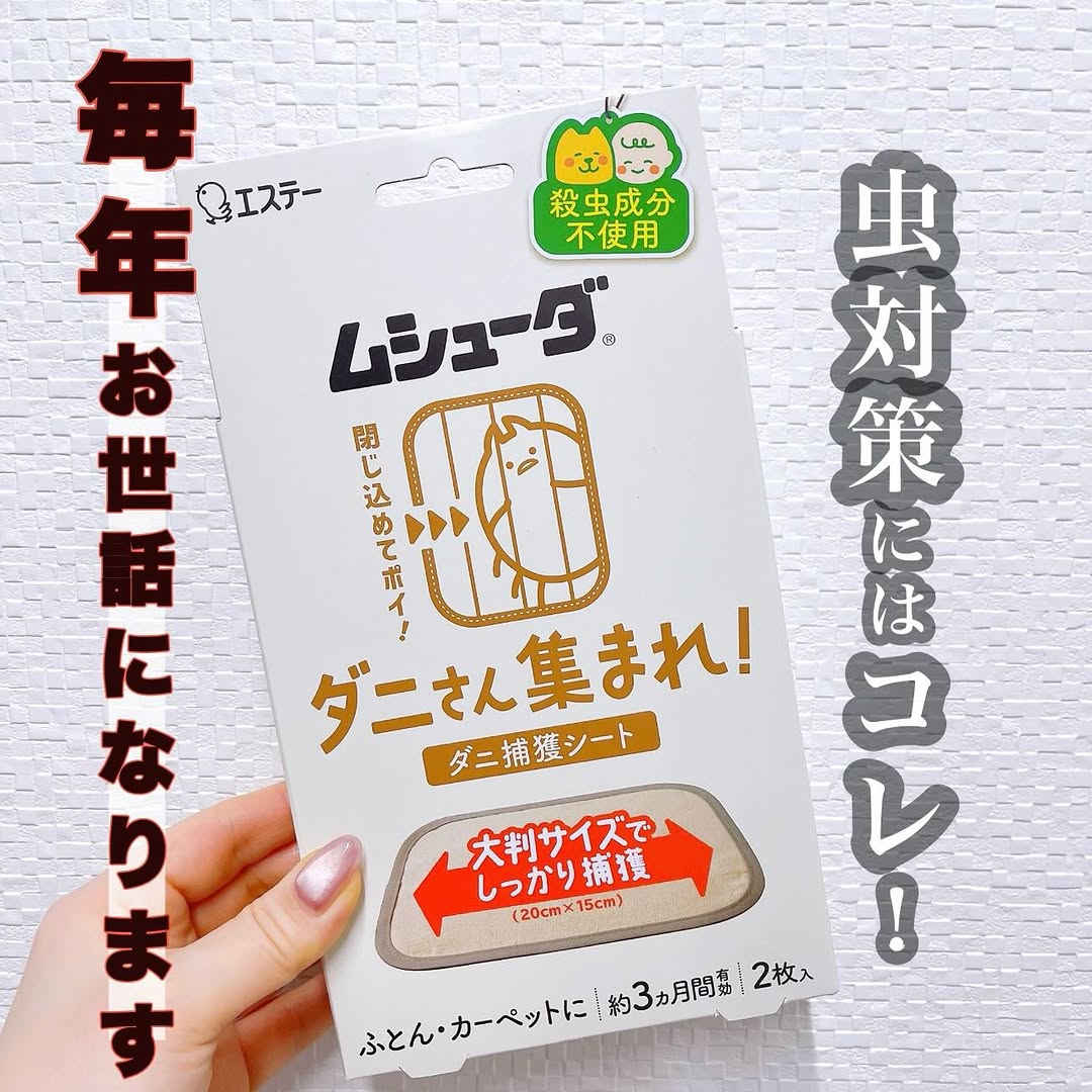 ムシューダ ダニさん集まれ! ダニ捕獲シート ダニが気になる場所に置くだけで 簡単ダニ対策をしてくれるシートになります☻♫♪♪ ●殺虫成分不使用。食品成分でダニを誘引します。 ●子供やペットのいるご家庭でもご使用いただけます。 ●誘引剤でダニを引き寄せ、大判サイズの強力な両面粘着シートでダニをしっかり捕獲。 ※本品はイエダニ・マダニを対象としたものではありません。 ●ダニのフンや死骸もまとめて、シートごと捨てることができます。 ●使いやすい個別包装タイプです。 置くだけでいぃので 助かりました😭😭🙏🏻🙏🏻 毎年刺されていて(´×∇×`) なぜ?自分だけ😭夫は平気なのにーーーっと怒りながら 毎年似たような商品を買っていました。 今回♡ 何かいぃのないかな〜っと思っていたら 当選して( ⩌⩊⩌)✧ 早速‼️‼️‼️‼️ 約三ヶ月間効果があるのと 日付が見やすい!! 貼るタイプじゃあなくて置くタイプなので楽””♡ どうしてもダニ系は…ワンコがいるのと੯‧̀͡⬮\ 刺されるタイプなので 毎年必須商品になります🙇🏻♀️ 1箱に2枚入りなので ベットにとりあえず!! まだまだ置きたい場所があるので リピしようと思います☻ #PR #エステー #ムシューダ #ダニさん集まれ #ダニ対策 #ダニ #ダニ捕獲シート #monipla #st_fan#リビング#寝室#ダニ刺される#嫌い#虫#フォロー募集#いいね#いいねありがとう