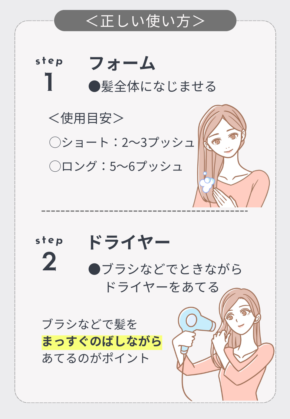 ※話題のクセ・うねりケア成分「トステア※1」自社最大量配合(業務用トステア※1 配合率をベースに開発)。フォームを髪になじませ、ドライヤーの熱風を当てながらセットするだけで、気になる「オトナくせ毛」がスッキリまっすぐ整い、理想の自分に近づきます。