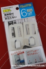 家庭用のホッチキスで壁に固定できる「フック付き金具」です。フックには6kgまで掛けることができます。