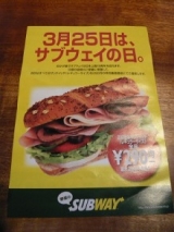 来たる3月25日は…そうです!わっちの大好きなサブウェイたんの日(人´ω`)♪ ( ノω)コッソリ <ちなみに、去年は3/26ニチだったよぅ毎年、変わるのか?!サブウェイの日は、サンドのレギュラーサイズぜーんぶ 290円均一(≧∇≦)ノわーいわーいwなので、ますますお得に美味しいサンド… 2011/03/04