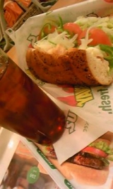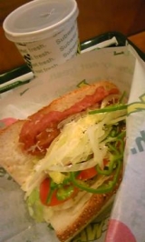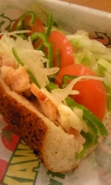 先日帰りが遅くなったので、頂いた無料券を使おうとサブウェイで夕食 いつもランチだったので、なんか新鮮(笑) チーズローストチキンははじめて食べるメニューなので楽しみ♪ 今回のカスタマイズは パン→ハニーオーツ(トースト) 野菜→ピクルスオリーブ抜き、トマト、ピーマ… 2011/01/30