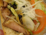 店内で焼き上げたパンにシャキシャキの野菜とローストビーフやチキンなどをたっぷりサンドイッチ。