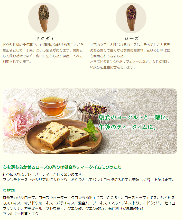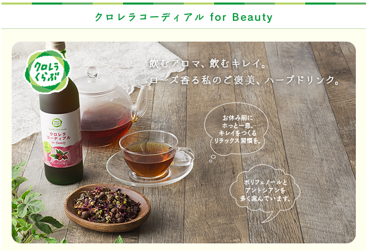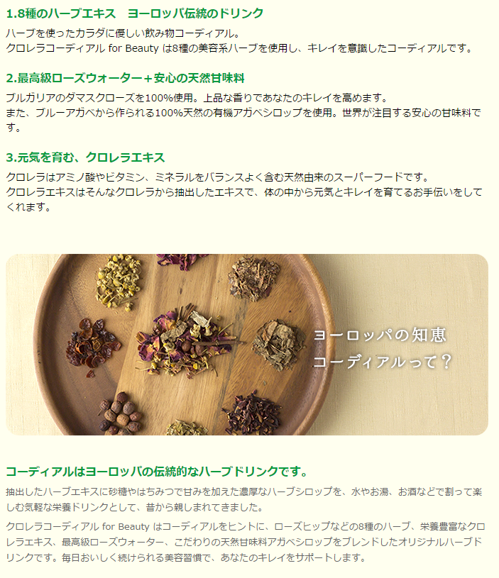 コーディアルとは、ヨーロッパの伝統的なハーブドリンクです。抽出したハーブエキスに砂糖やはちみつで甘みを加えた濃厚なハーブシロップを、水やお湯、お酒などで割って楽しむ気軽な栄養ドリンクとして、昔から親しまれてきました。 クロレラコーディアル for Beauty は、ローズヒップなどの8種のハーブ、栄養豊富なクロレラエキス、最高級ローズウォーター、こだわりの天然甘味料アガベシロップをブレンドしたオリジナルハーブドリンクです。毎日おいしく続けられる美容習慣で、あなたのキレイをサポートします。