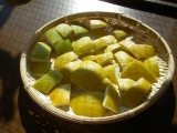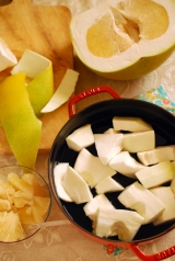全記事でご紹介した晩白柚ですが、身はもちろん、表皮も白い皮もちゃんと活用できるんです!! 添付されていたプリントに作り方が書いてあったので、挑戦してみました まずは普通に果実を食べます 甘夏とグレープフルーツの中間のようなお味(^^) 真ん中に近い部分は酸っぱい… 2012/01/31