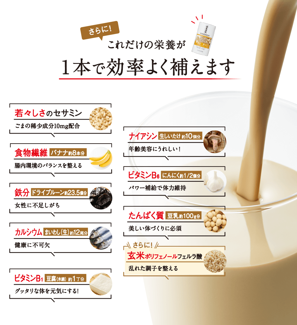 若々しさを引き出す、玄米由来の米ぬかとごまの栄養を1本に凝縮。 (1本160g×30本) 若々しさに欠かせない栄養が、効率よく、手軽に補える、強い味方です。 毎日飲んでも飽きのこない豆乳をベースに、和三蜜糖の自然な甘さをプラス。ごまの香ばしさも感じる豊かな味わいです。 レビュー数 : 251 |