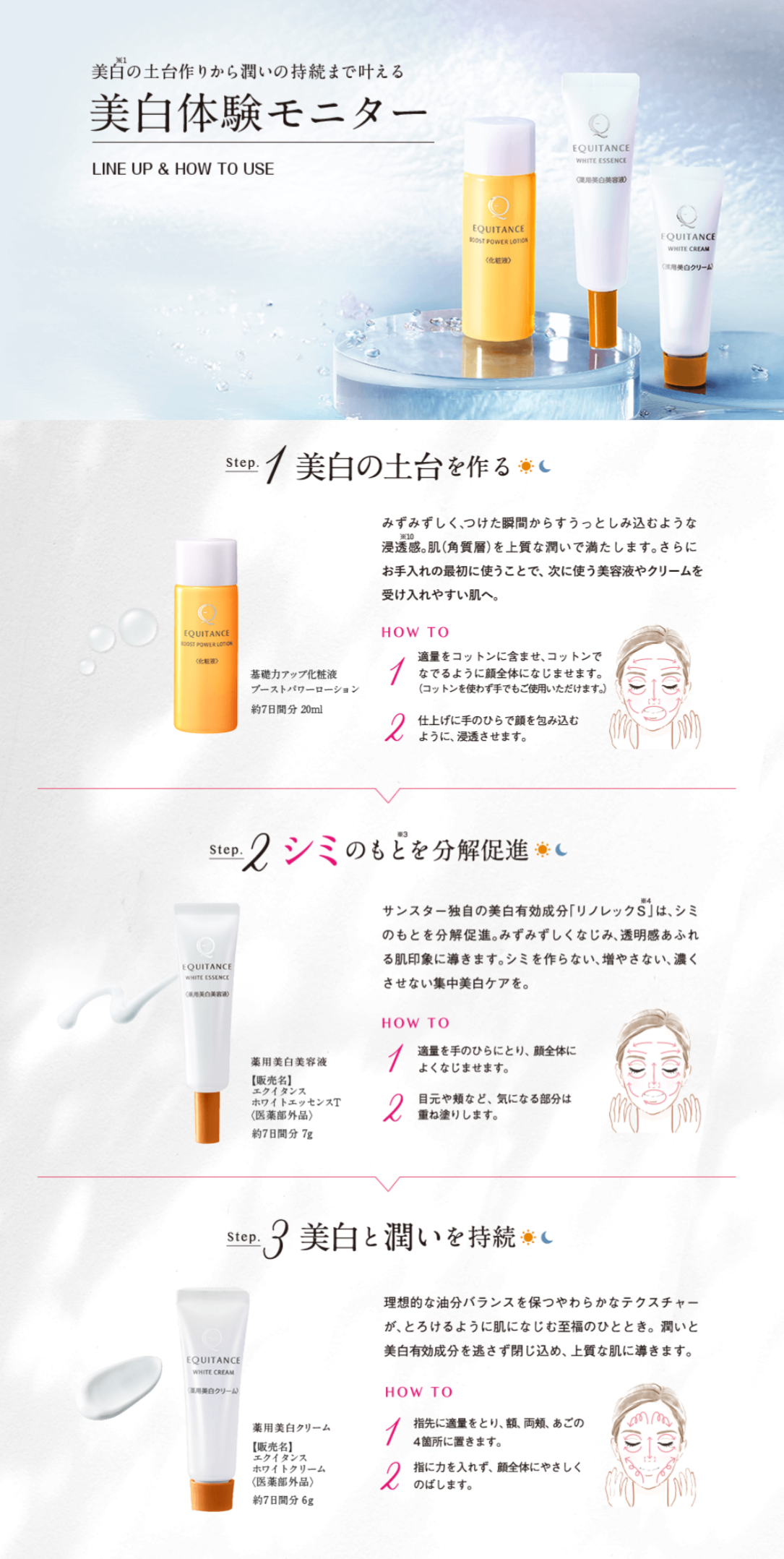 ※Instagramに投稿する際には #EQUITANCE #エクイタンス #エイジングケア #透明美肌体験 #美白ケア #サンスター #monipla #sunstarshop_fan のハッシュタグをつけて投稿してください!