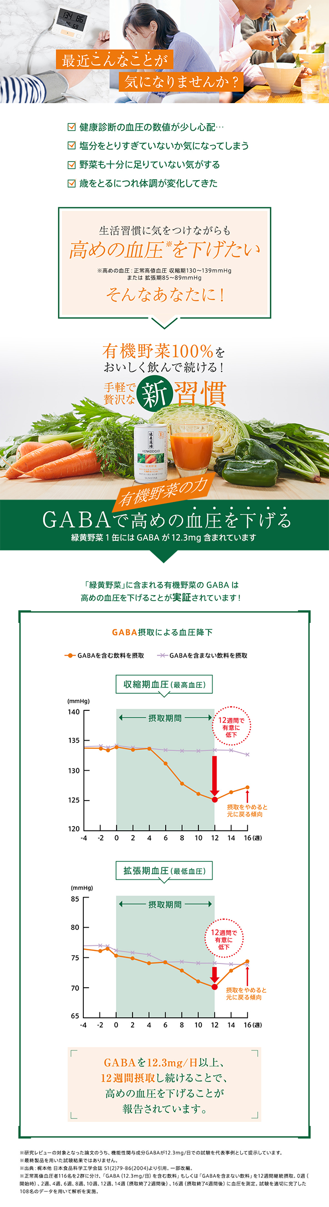 有機野菜の力(GABA)で高めの血圧を下げます。使用している野菜はすべて有機野菜。野菜のうまみを引き出す乳酸菌発酵と、野菜を食べているような食感を生み出すすりつぶしピューレを配合。砂糖*、食塩、香料、保存料、着色料は一切不使用です。