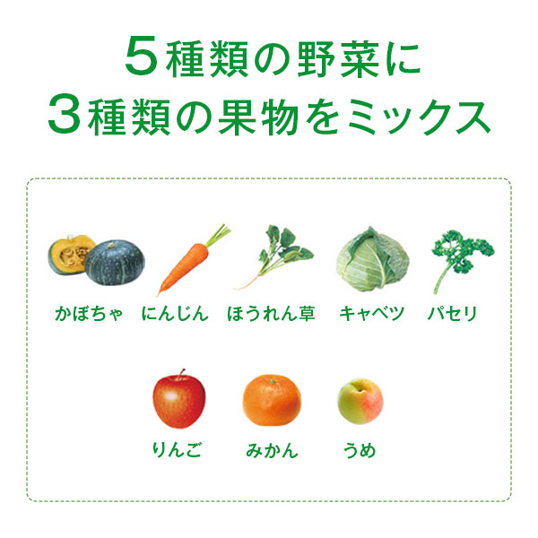 5種類の国産野菜に3種類の国産果物をプラス。水を一滴も使わずに野菜や果物を搾ったままのストレート汁とすりつぶしたピューレを贅沢に配合。