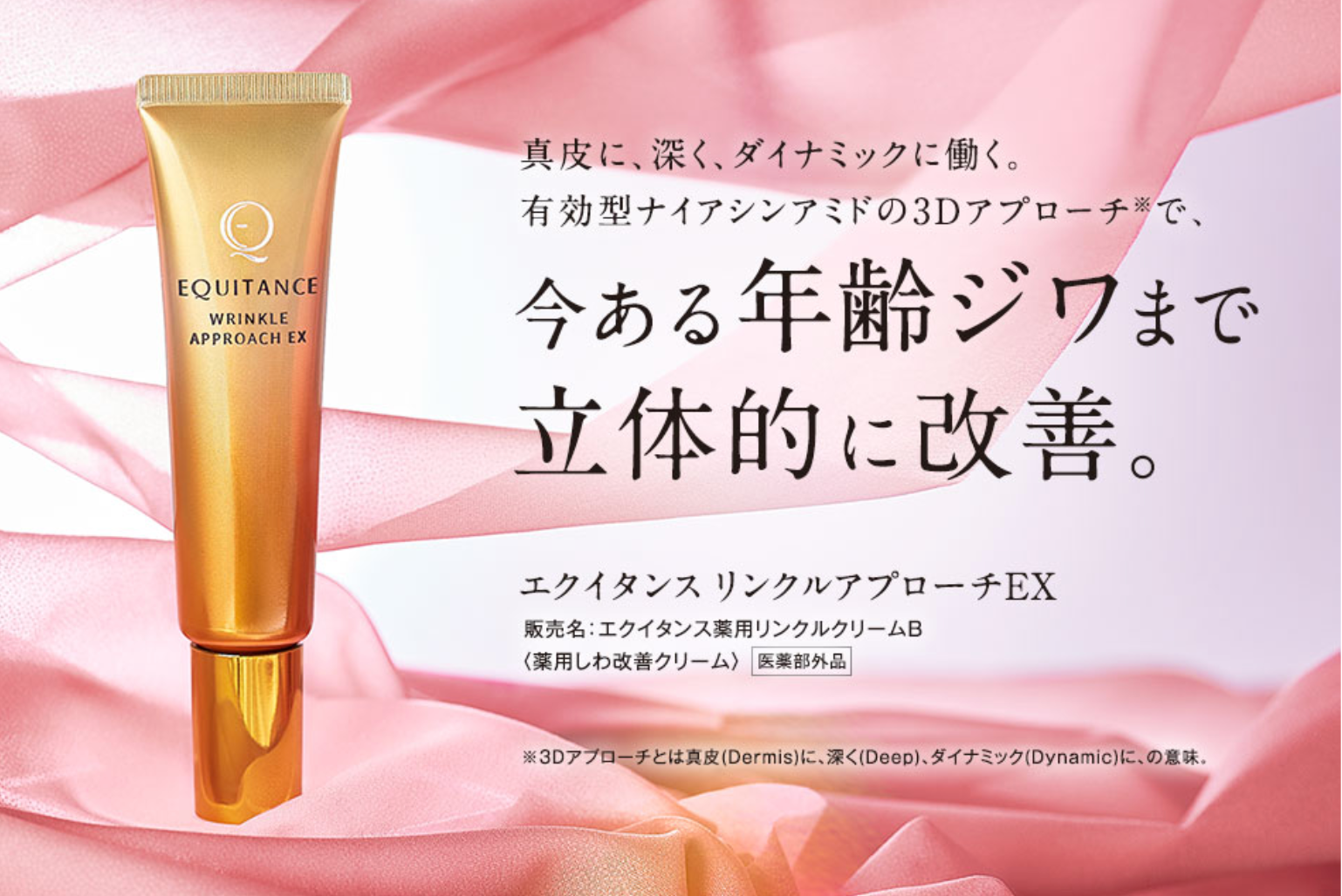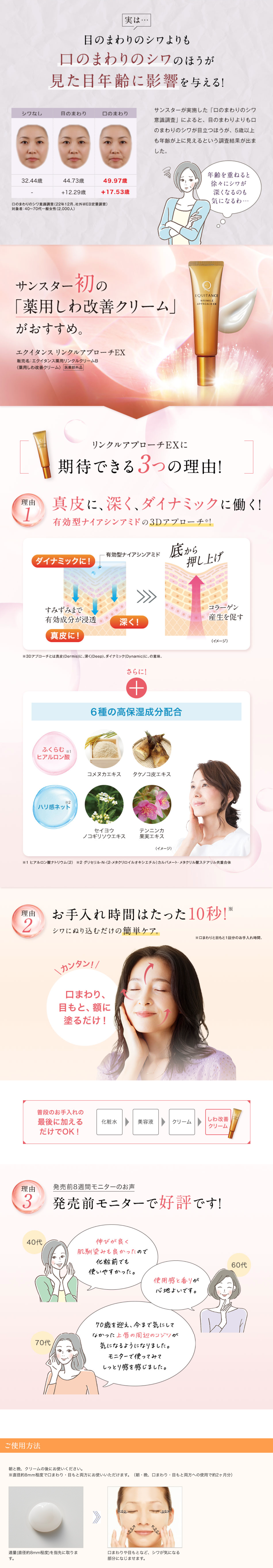 「エクイタンス リンクルアプローチEX」は、30年以上にわたるサンスターのコラーゲン研究の知見を活かし開発した薬用しわ改善クリーム(医薬部外品)です。シワ改善成分「有効型ナイアシンアミド」の3Dアプローチ※により、コラーゲン産生を促進することで真皮から肌を押し上げ、今ある年齢ジワを立体的に改善します。さらに6種類の高保湿成分を配合。ふっくら柔らかなハリを与えます。「口まわり」の使用に適した処方設計を目指し、伸びがよく、控えめな香りです。