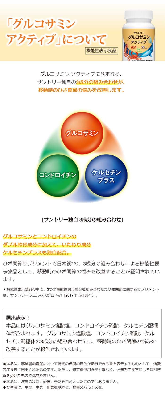 いくつになってもハツラツとした毎日を過ごすために歩くことはとても大切です。そこでサントリーが着目したのがグルコサミンとコンドロイチンのダブル軟骨成分と、いたわり成分ケルセチンプラスでした。『グルコサミン アクティブ』はひざ関節サプリメントで日本初※1の、3成分の組み合わせによる「機能性表示食品」として、移動時のひざ関節の悩みを改善する力が証明されています。