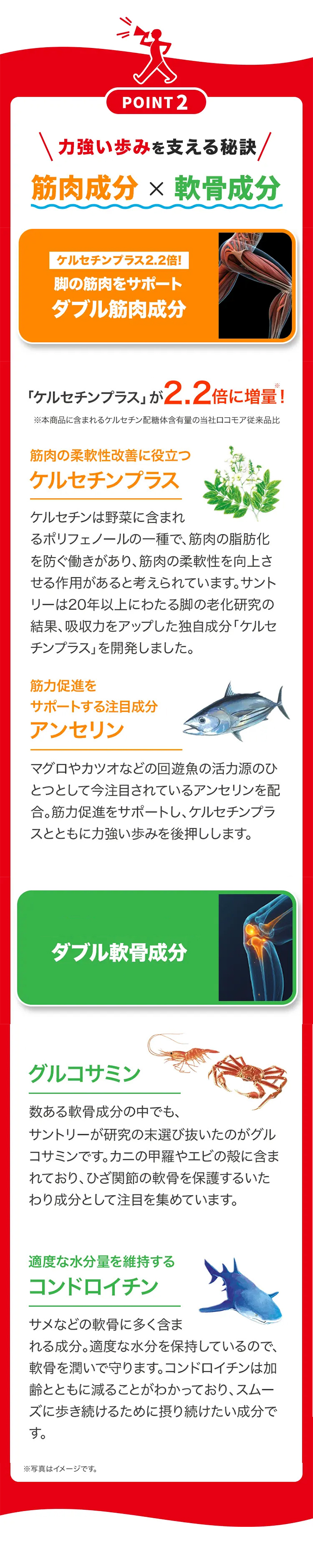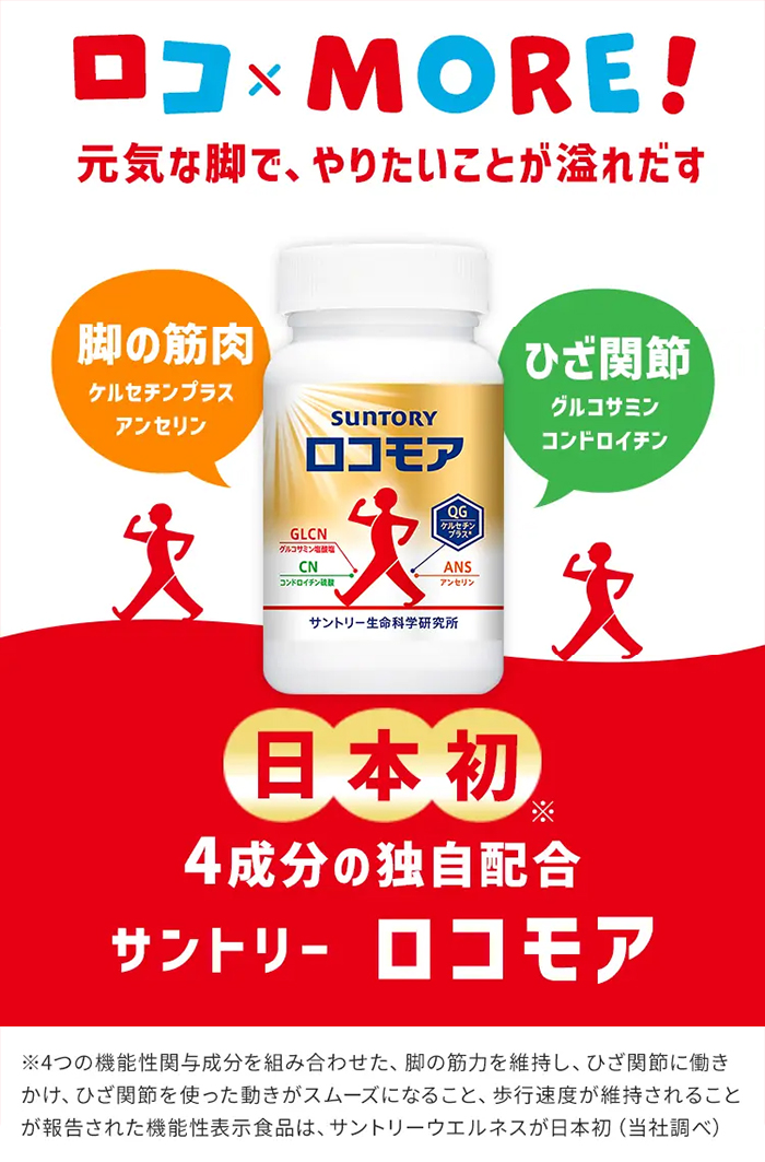 おかげさまでサントリーは連続売上No.1(※1)を達成。累計販売本数は4,000万本(※2)を突破しました。毎日の健康づくりを意識する方のサプリメントとして『ロコモア』をご検討ください。
