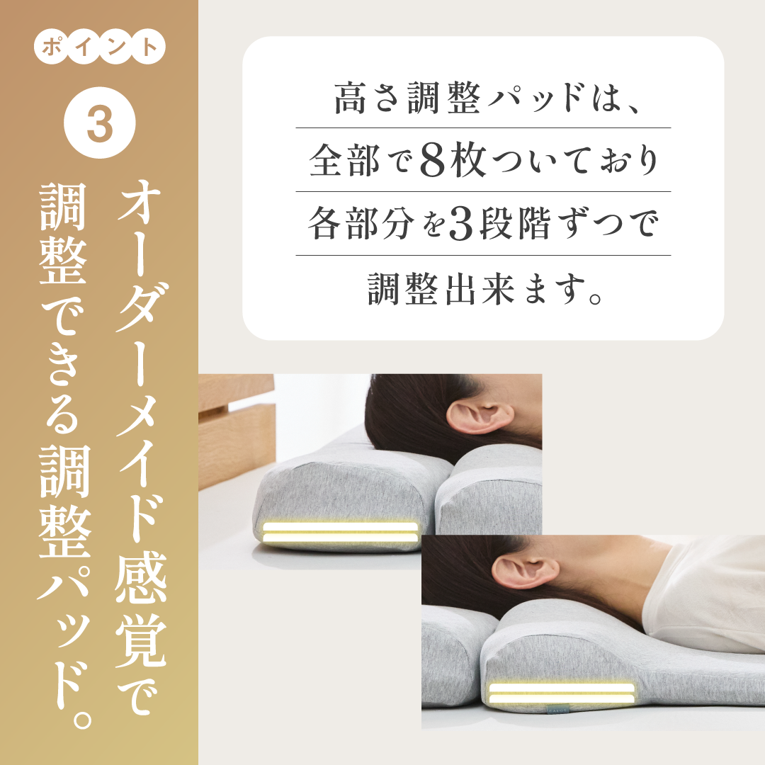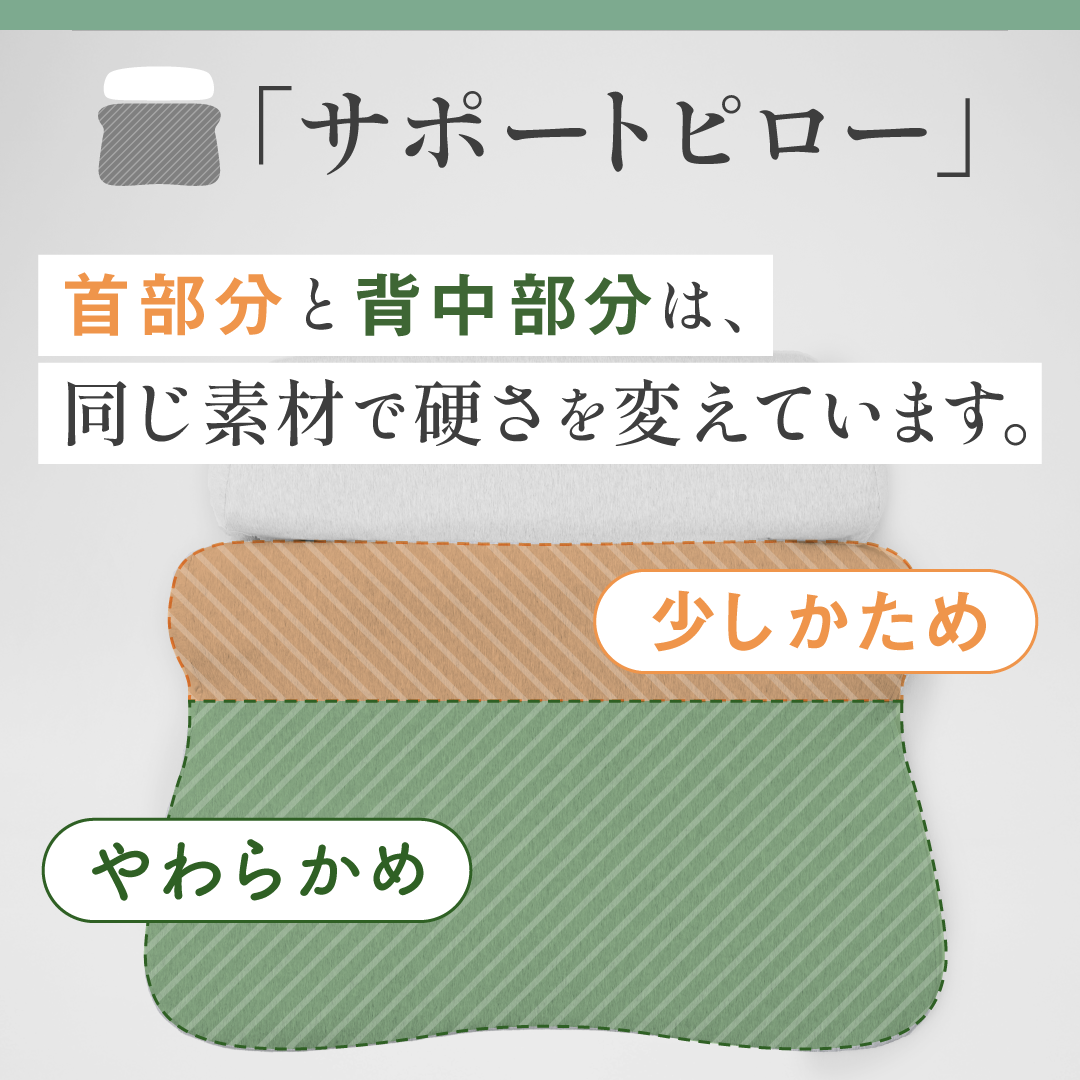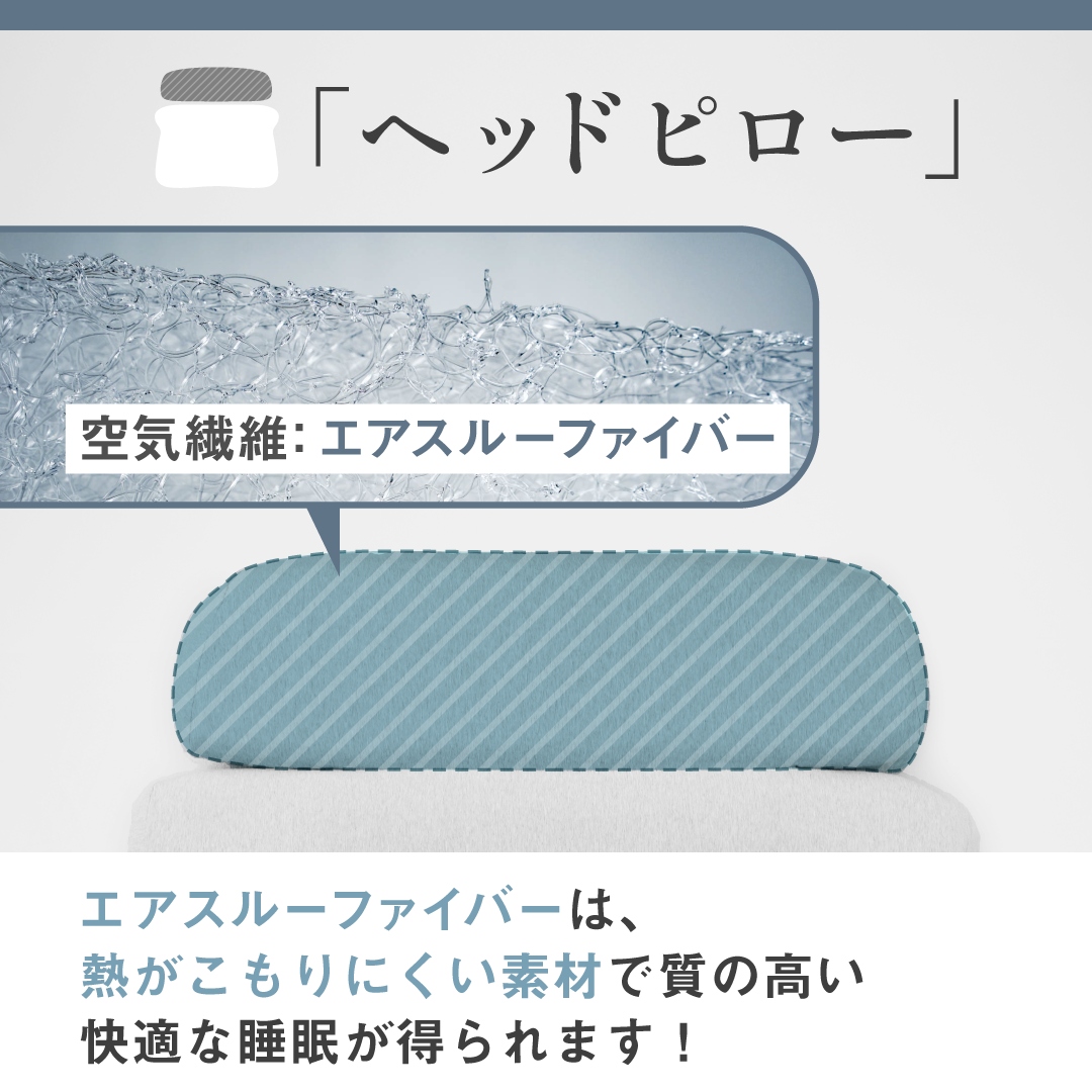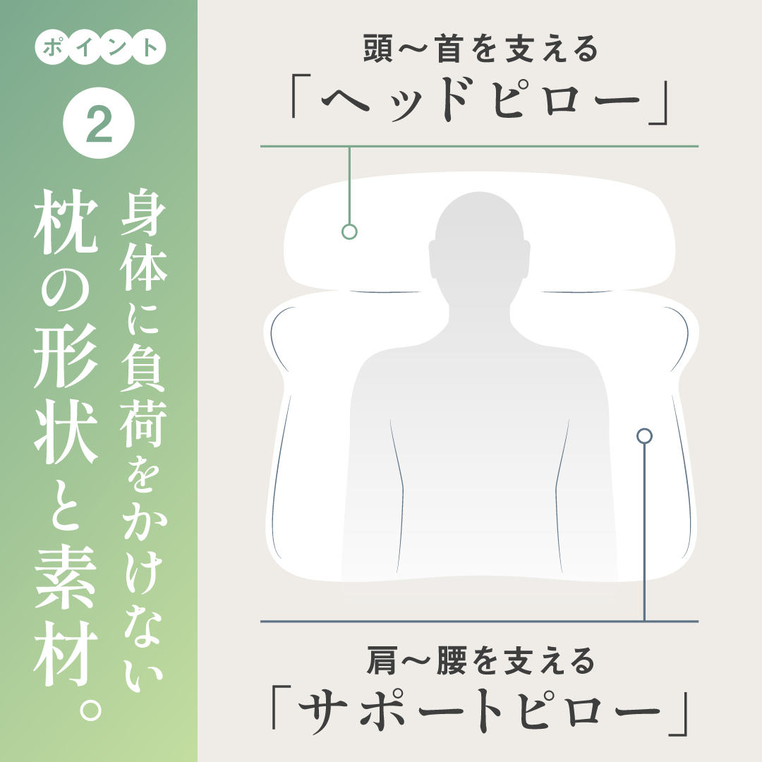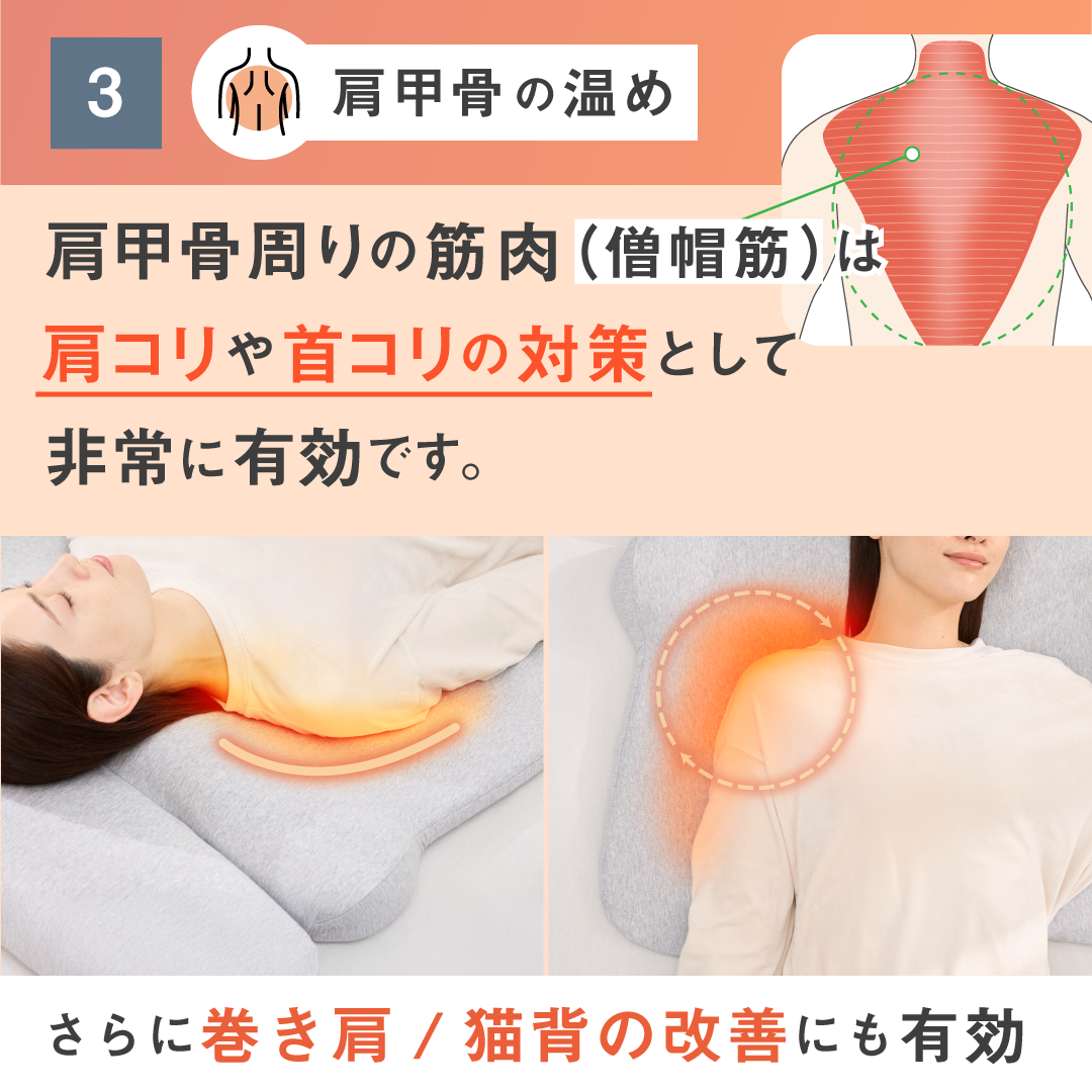 首・肩・腰・肩甲骨周りを最適な素材で支えながら40度で温められる枕。カラダ全体が温まり、心地よい深い睡眠へと誘います。今までの首と肩が温まる枕をお客様の声をもとに改良し、腰・肩甲骨まで温められる枕を開発しました。背中まで支える立体構造により、頭や首を面で受け止め、身体への負担を最小限に抑えます。