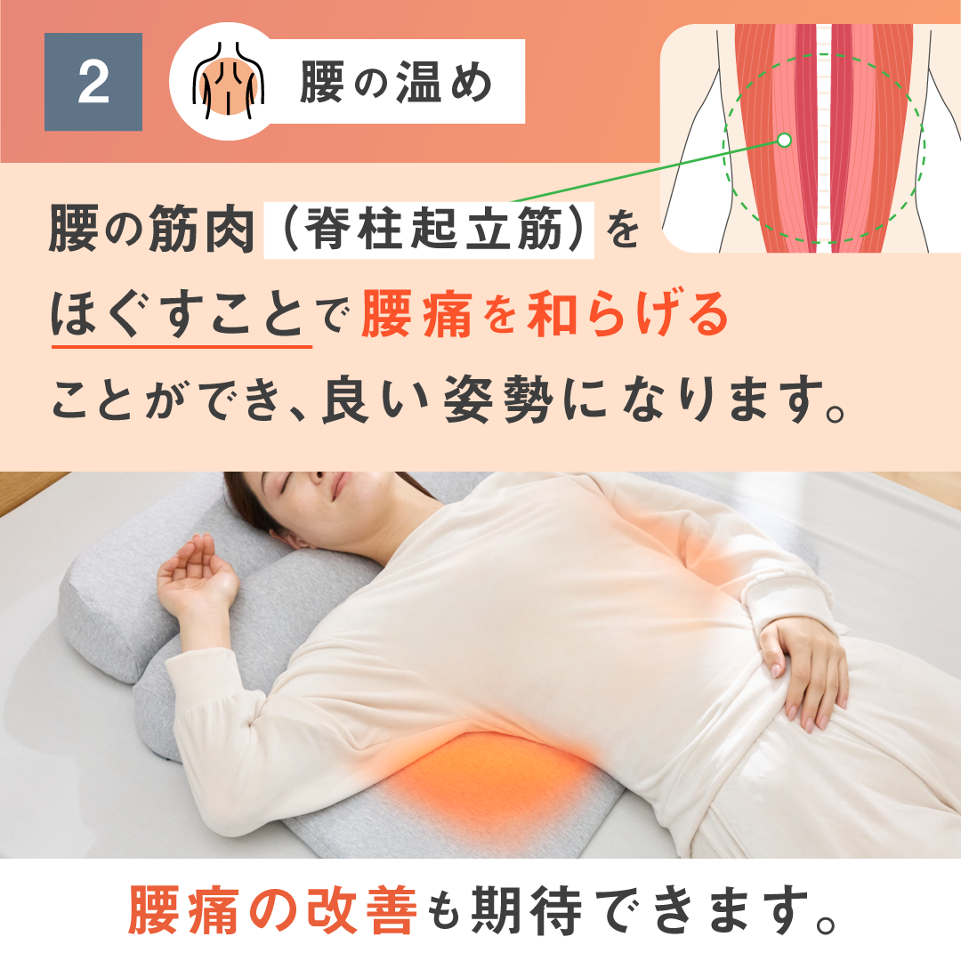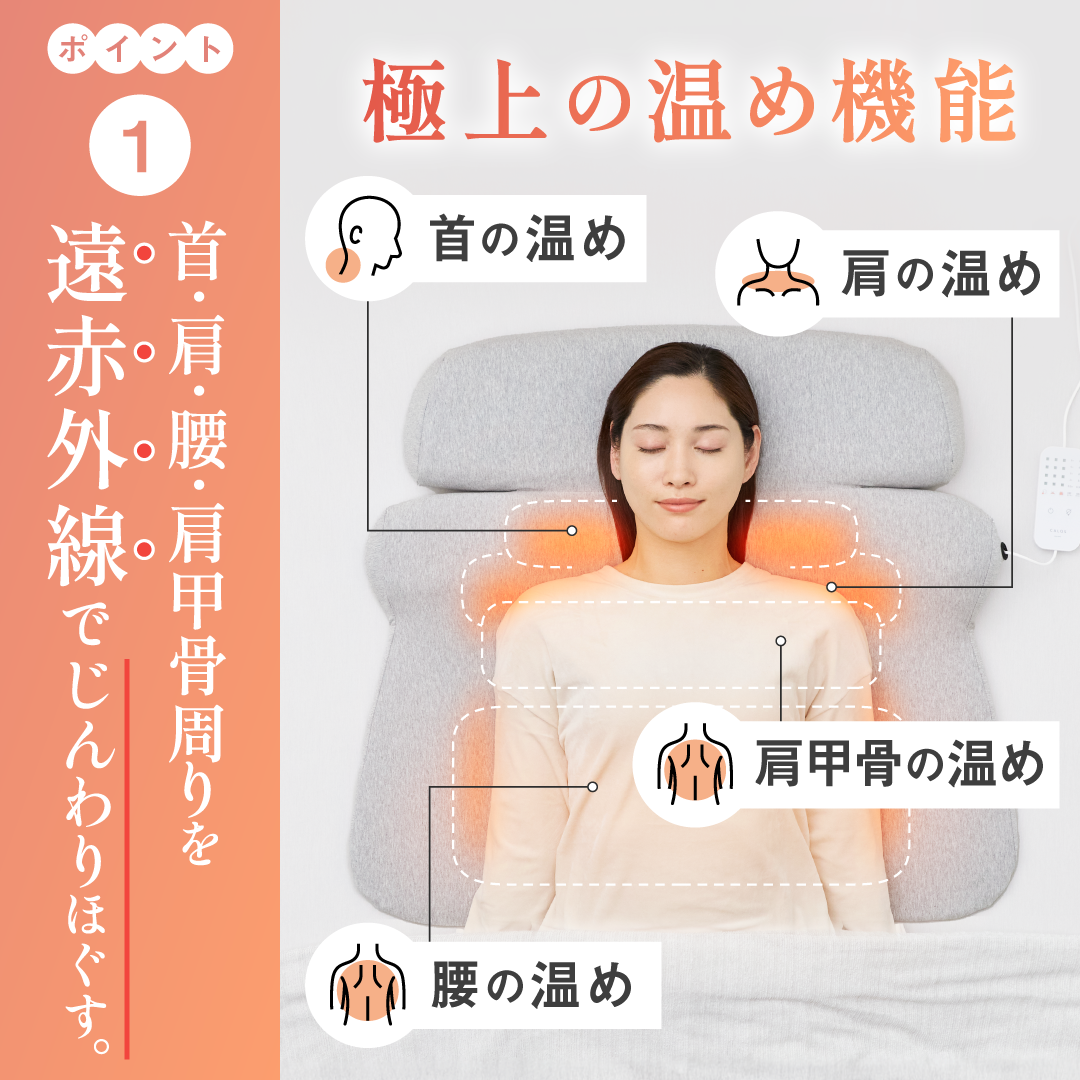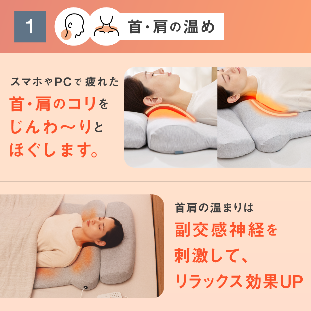 首と肩と腰を40度で15分間温めることで心地よい睡眠を手に入れる為の枕です。