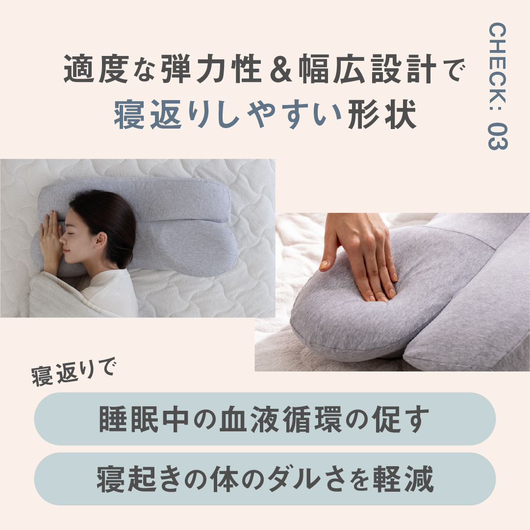 首・肩を最適な素材で支えながら40度で温められる横寝のしやすさを意識して設計した枕。カラダ全体が温まり、心地よい深い睡眠へと誘います。今までの首と肩が温まる枕をお客様の中でも横寝をする方の声をもとに改良し開発しました。