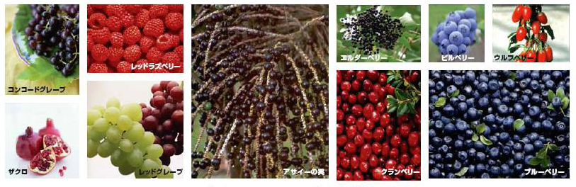 アサイーベリー、コンコードグレープ、レッドグレープ、ブルーベリー、レッドラズベリー、クランベリー、ウルフベリー、エルダーベリー、ブラッククミンシード*、シャルドネグレープ種子*、ビルベリー、ザクロ、大豆レシチン、緑茶*、ブドウ種子