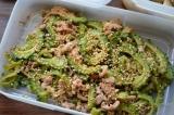 夫が夜ごはんいらない日だったけど、おかずをいくつか作った ゴーヤと豚肉炒め ゴーヤはスライスして塩もみして洗って水にさらしておいた ごま油で豚肉とゴーヤを炒めて、砂糖1みりん1酒1で味つけしさらに炒め、最後に醤油1を加えて全体を混ぜ、軽くすった白ごまをたっぷりかけてできあがり 甘みを強くし… 2014/07/25