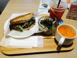 自宅から徒歩圏内にあるセルフのお洒落系カフェでランチを 食欲が全くなく… それでも何か食べなくては!と、軽食が充実しているこちらに パスタやカフェ丼、サンドなんかがあります 1番さっぱりな気がして柚子からしハンバーグのサンドをチョイス ランチセットはスープ、サラダ、ドリンク付き このトマト… 2014/07/21