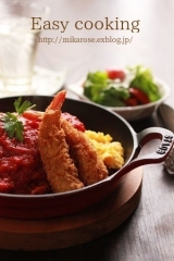 1月15日 今日は冷凍庫の整理 ちゃちゃっと簡単ランチです トマトのホール缶に固形ブイヨンとお砂糖を加え7分煮ます 途中マッシュルーム投入 その間にレンジでチキンライス7分 同時にエビフライを揚げます ふわふわ卵を焼き… 2015/01/15