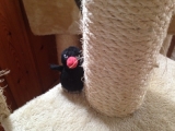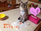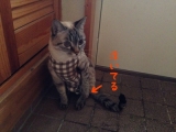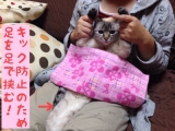 クッキーの消毒を朝晩していますが、娘2号が大体手伝ってくれます娘2号がソファに座り、写真のようにクッキーを抱っこ油断すると、腫瘍部分を舐めようとするので、注意が必要です!まずはカット綿をお湯に濡らして、腫瘍の周りを拭いて綺麗にしてから、消毒液を霧吹きで吹きかけているのですが、時々沁みるようなんで… 2014/09/10