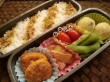 9月16日の長男のお弁当です[おにぎり] スパイシーチキンナゲット じゃが芋フライ プチトマト 枝豆 レーズン入りさつま芋マッシュ 「今日の弁当ウマかった[るんるん]」と言って帰ってきた長男 「さつま芋のボールになってるの作ったのママだよね?」 「そうそうデザート代わりに入れ… 2014/09/17
