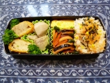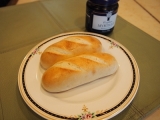 テーブルマークさんの冷凍パン プチパンオーブントースターで温め包丁で切り1つは、レタス、スクランブルエッグ、プチトマト、マヨネーズでサンドウィッチにレタスで見えませんが、下もパンにはさまれてます 2014/11/17