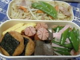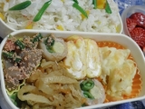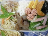 塩焼きそば 具は もやし人参豚肉 玉子焼き のりっこチキン 自然解凍でOK!ってところが 嬉しい 海苔のアクセントも弁当を引き立てますね お花ウインナー 今日のウインナーはボイル 雷こんにゃく スナップエンドウサラダ 手作りの玉葱ドレッシング漬けに … 2015/05/11