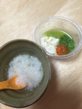 久々の初の食材 スナップえんどう7分粥 軽くすりつぶし 豆腐の野菜ソース(絹豆腐、ブロッコリー、にんじん、スナップえんどう)野菜スープ離乳食の本見たら、3回食初の9ヶ月からとなってたのんびくん、ちょっと早まってたみたい風邪気味だしまた2回食で様子見です 2015/04/13