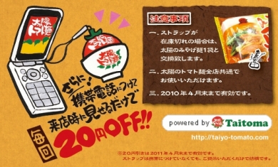 太陽のトマト麺オリジナルストラップ特別プレゼント!に当選させていただき、ありがとうございました!3月は、ものすごく仕事が忙しくて、当選通知メールがなくて、あわてましたが・・なんとか見つかりました・・よかったぁ・・・やったぁ~↓これが、太陽のトマト麺のストラップです!ストラップは、ラーメン鉢にトマトが入っているデザインでとてもかわいい・・♪ただのストラップではありません!来店時にスタッフに提示すると、毎回お会計から20円OFFなのです。(2011年3月末まで有効)これは、プレミアム!最初のモニターに当選して依頼、すっかり、...