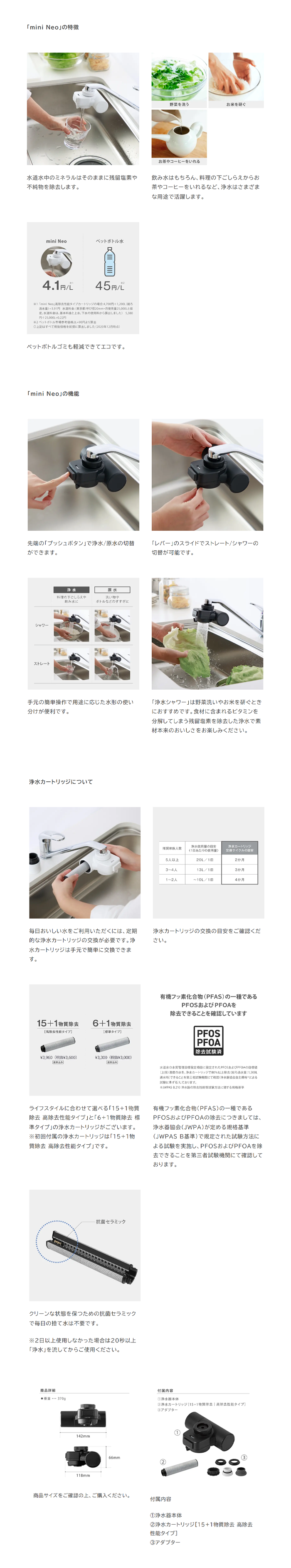 手軽においしい水が楽しめる「蛇口直結型」の浄水器です。明るい配色のキッチンに馴染むホワイトボディのミニマルデザインです。水道水中のミネラルはそのままに残留塩素や不純物を除去します。飲み水はもちろん、料理の下ごしらえからお茶やコーヒーをいれるなど、さまざまな用途で活躍します。 高除去性能タイプの浄水カートリッジが1本付いています。 浄水カートリッジは手元で簡単に交換できます。クリーンな状態を保つための抗菌セラミックで毎日の捨て水は不要です。 ※2日以上使用しなかった場合は20秒以上「浄水」を流してからご使用ください。浄水カートリッジは消耗品です。毎日おいしい水をご利用いただくには、定期的な浄水カートリッジの交換が必要です。