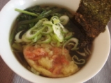 麺{小麦粉、食塩、ほうれん草粉末、りんごファイバー、酒精、ソルビット、塩化カリウム、クチナシ色素、増粘剤(キサンタンガム)、焼成カルシウム}スープ{しょうゆ(本醸造)、風味原料(かつお節エキス、かつお節、こんぶエキス)、糖類(砂糖、果糖ぶどう糖液糖、ぶどう糖)、米発酵調味料、食塩、みりん、たんぱく加水分解物、酵母エキス、調味料(アミノ酸等)、酸味料、香料、カラメル色素、(原材料の一部に小麦、さば、大豆、りんごを含む)}