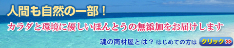 魂の商材屋は、極限まで化学合成物質を可能な限り使わない「本当のナチュラル&無添加』商品だけを超厳選して販売しているショップです。赤ちゃん・乾燥肌・敏感肌等にも安心して使っていただける完全無添加石鹸、無添加シャンプー,無添加化粧品、無添加スキンケア商品や健康食品、マルチミネラル,亜麻仁油ほかトランス脂肪酸ゼロのオーガニック食用油、無添加の生活用品などを販売。本当の安心・安全を謳える原材料・成分で作った商品だけ。配合成分の「全成分表記」は基本。真のナチュラルライフを望む方、小さいお子様のいるご家庭、アトピー・,乾燥肌等のお悩みを持つ方、健康な毎日を送りたい大勢にご支持いただいております。