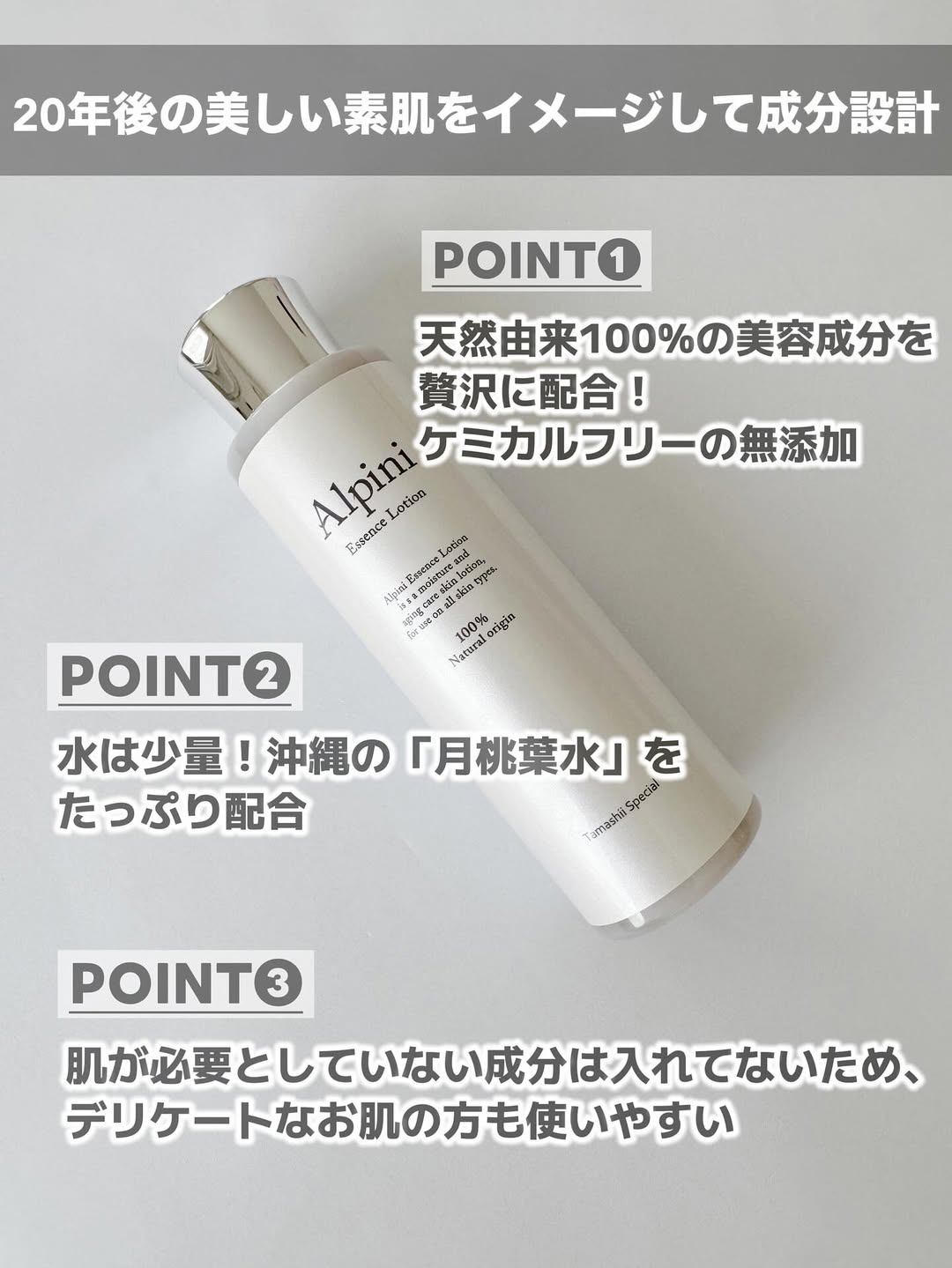 アルピニエッセンスローション(月桃の香り)はオーガニック無添加保湿化粧水。天然由来100%+オーガニック成分13種+完全無添加。水は少量に抑えて月桃水(月桃葉のハーブウォーター)をメイン配合し、美肌成分を贅沢に配合したオーガニック化粧水。重ねてつけて美容液不要の美容液グレード。肌乾燥・ハリ・キメ・乾燥小じわが気になる方の『高保湿・整肌・(プレ)エイジングケア』に的確。ハリ・引き締め・柔軟性に月桃水、保湿・美肌にガゴメエキス・シルクエキス・ダイズイソフラボン・ザクロエキス等を配合。月桃水は沖縄で自然栽培(無農薬・無肥料)された月桃葉使用。ハリのある、キメの整った美しい素肌へと導きます。『美しく肌年齢を重ねたい』あらゆる方におススメ。月桃の澄み切ったシャープな香りも魅力。プレエイジングケアで20代からご使用頂けます。●合成界面活性剤・石油系原料・合成ポリマー・エタノール不使用。化学合成の防腐剤(パラベン・フェノキシエタノール)・酸化防止剤・色素・人工香料無添加。●『Tamashii Special』は弊社ネプト・プランニングの登録商標です。登録第6258121号。