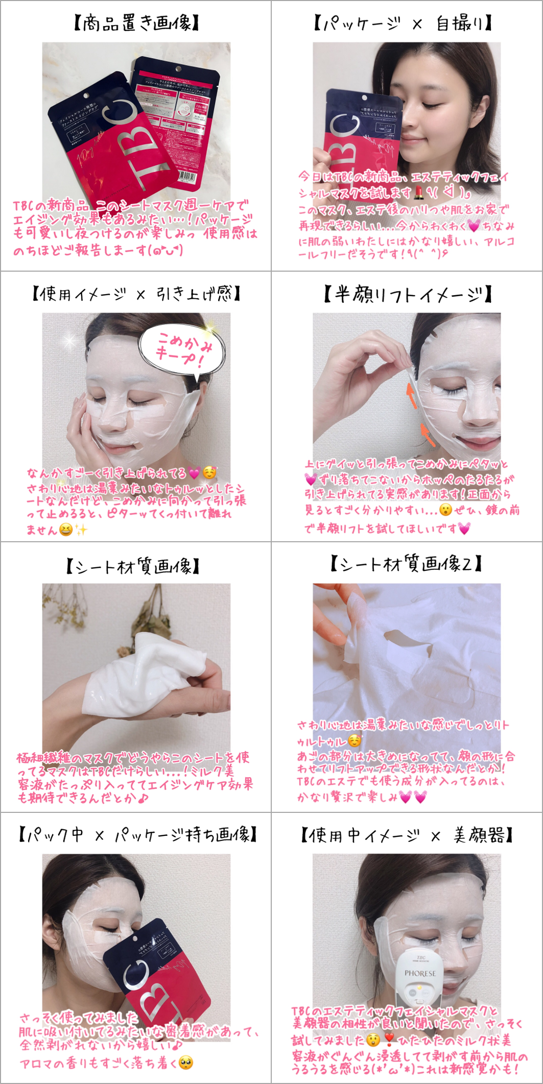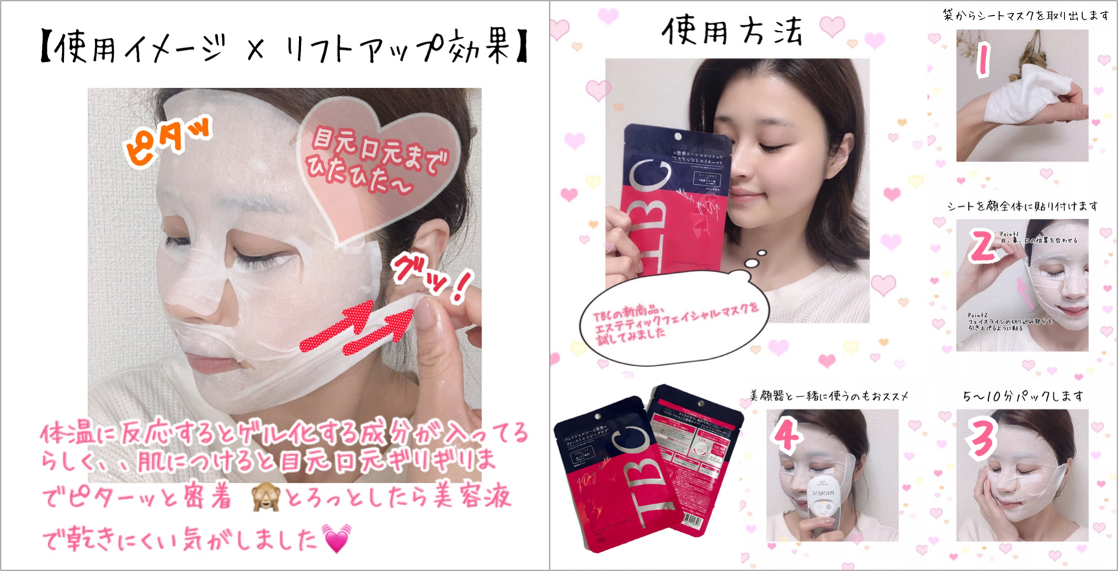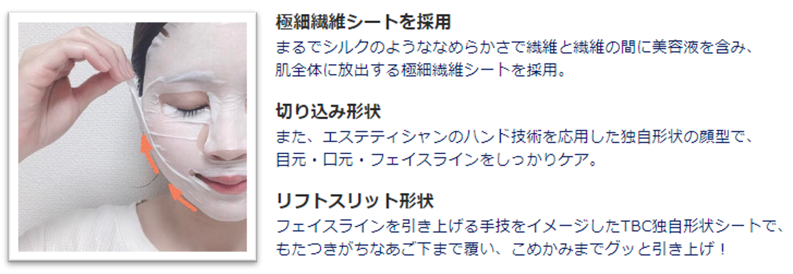 エステティックフェイシャルマスクは、TBCフェイシャルコースに基づいた厳選美容成分※2を配合し、エステティシャンのケアをイメージしたTBC独自のリフトスリット形状シートのシート美容液マスクです。