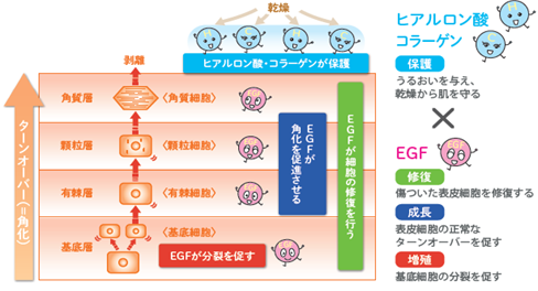 EGFとの相乗効果でターンオーバーの正常化をサポートする「ヒアルロン酸Na」「水溶性コラーゲン」も配合。