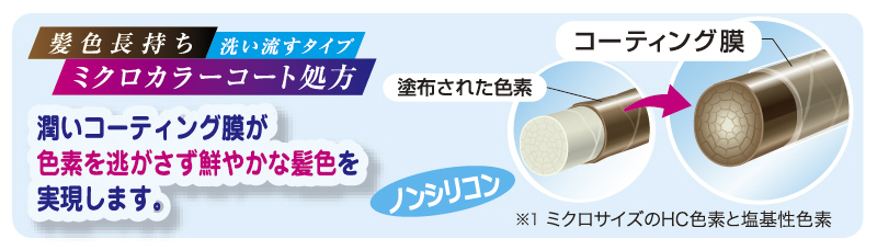 Wカラー成分※1で白髪を着色し、「ミクロカラーコート処方(特許 第6296241号)」で髪表面に被膜を形成。