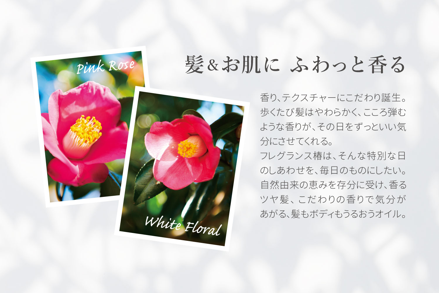 フレグランス椿シリーズは、古代より美容に用いられてきた「ツバキオイル」と「香り」を組み合わせた、ナチュラル発想のオイル。「なりたいイメージ」を香りと共に楽しみながら「美しい髪」と「健やかな地肌」へ整えます。
