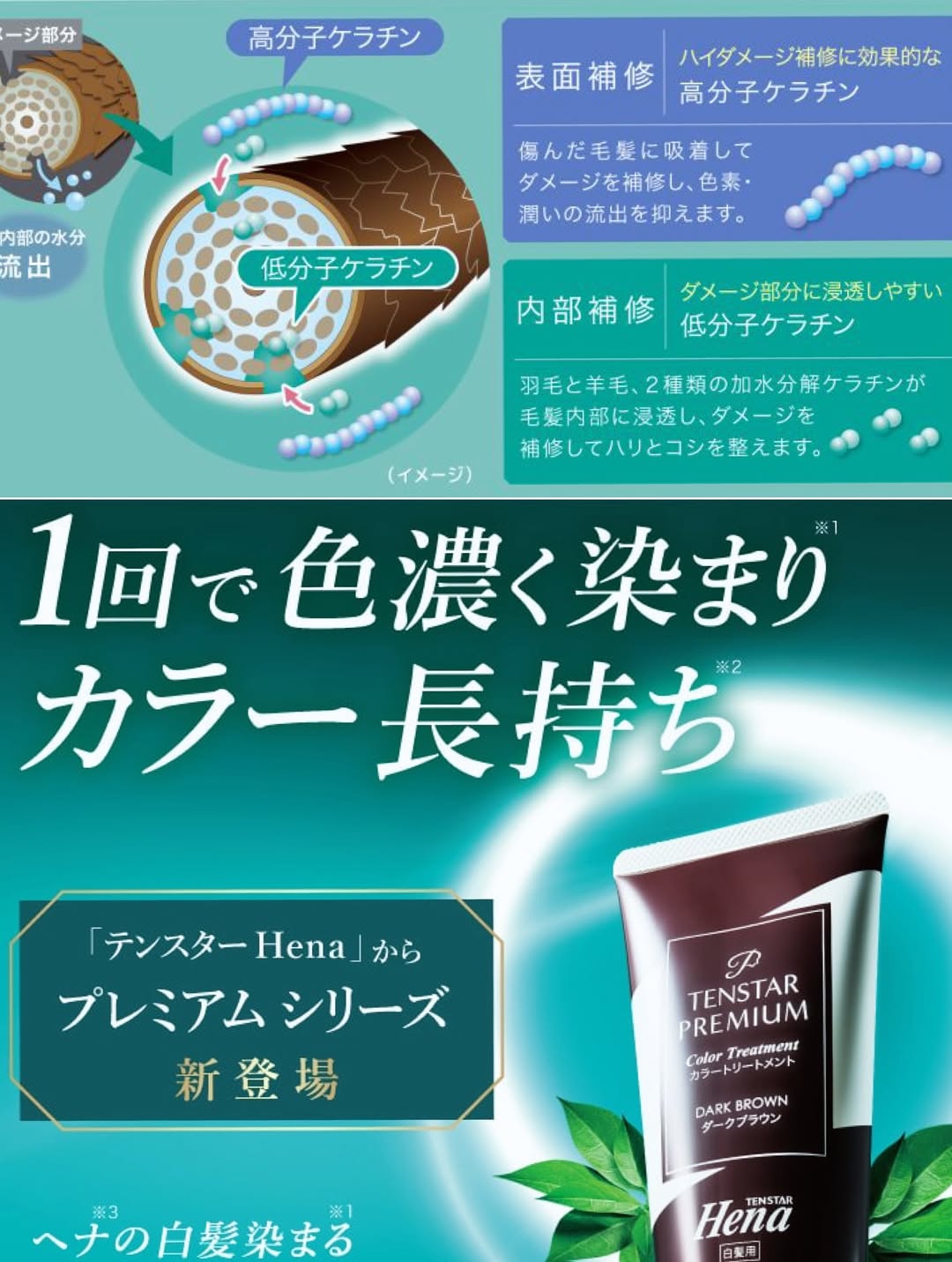 テンスターHenaからプレミアムシリーズが新登場しました。 染まりと色持ちを強化し、進化を遂げたカラートリートメントです。 白髪が1回でより良く染まり※1、カラーも長持ち※2。 さらに、髪のダメージを補修し、ハリ・コシに満ちた艶やかな髪に導く、 白髪を染めながらトリートメントする染毛料です。 ※1 着色効果による ※2 当社比
