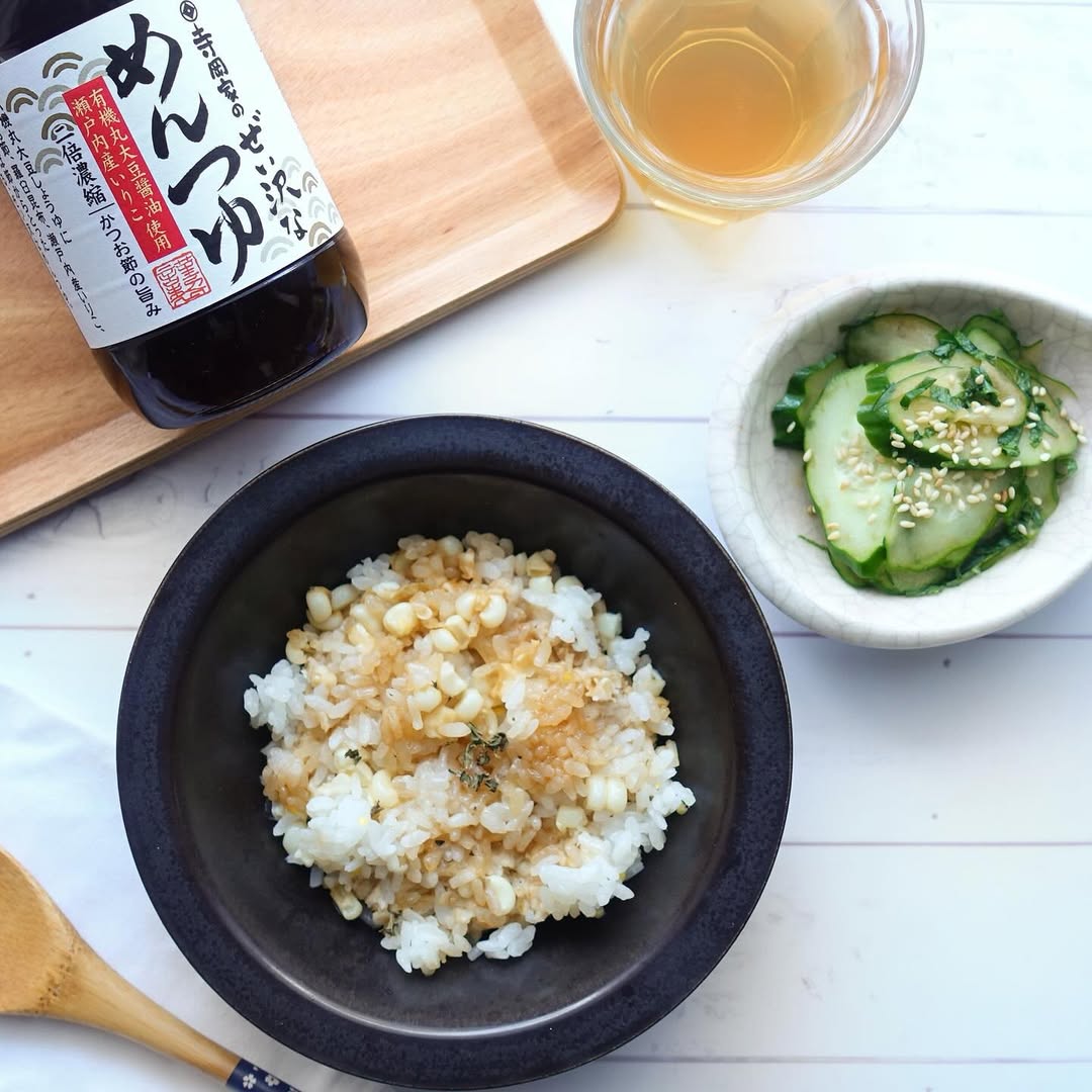 夏ごはんのおともに"寺岡家のぜい沢なめんつゆ" とうもろこしご飯ときゅうり×大葉のさっぱり和えで夏ご飯をいただきました〜🥢 あまみたっぷりの白いとうころこし. ちょっと贅沢なめんつゆとバターで旨味とコクたっぷりのご飯に♪ きゅうりと大葉はめんつゆ・ごま油・炒りごまでさっぱりと♪ 焼津産かつお節、羅臼昆布、瀬戸内産いりこ、国産鯖節… 国産だしのうまみがぎゅっと詰まった寺岡家のぜい沢なめんつゆ. かけるだけ・混ぜるだけでも味が決まります! 冷やしうどんやそうめんにもぴったり. ぜひこの夏使ってみてくださいね♡ #PR #寺岡家 #寺岡有機醸造 #寺岡家のぜい沢なめんつゆ #ぜい沢なめんつゆ #めんつゆ #めんつゆレシピ #めんつゆアレンジ #麺つゆ #そうめん #そうめんつゆ #そうめんレシピ #そうめんアレンジ #時短レシピ #時短料理 #時短ごはん #おうちごはん #麺レシピ #monipla #teraokake_fan