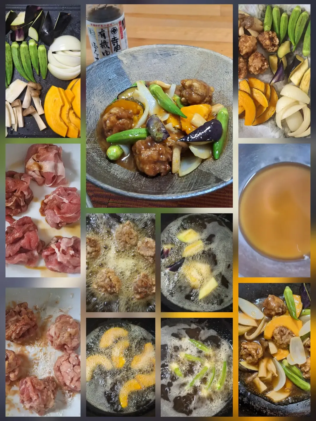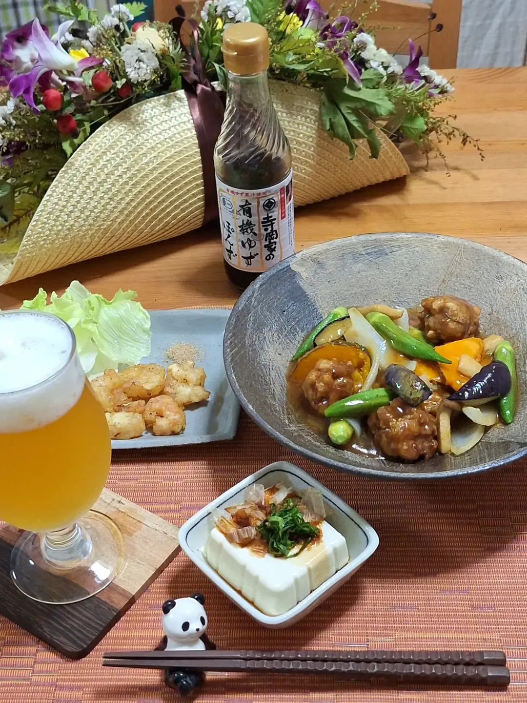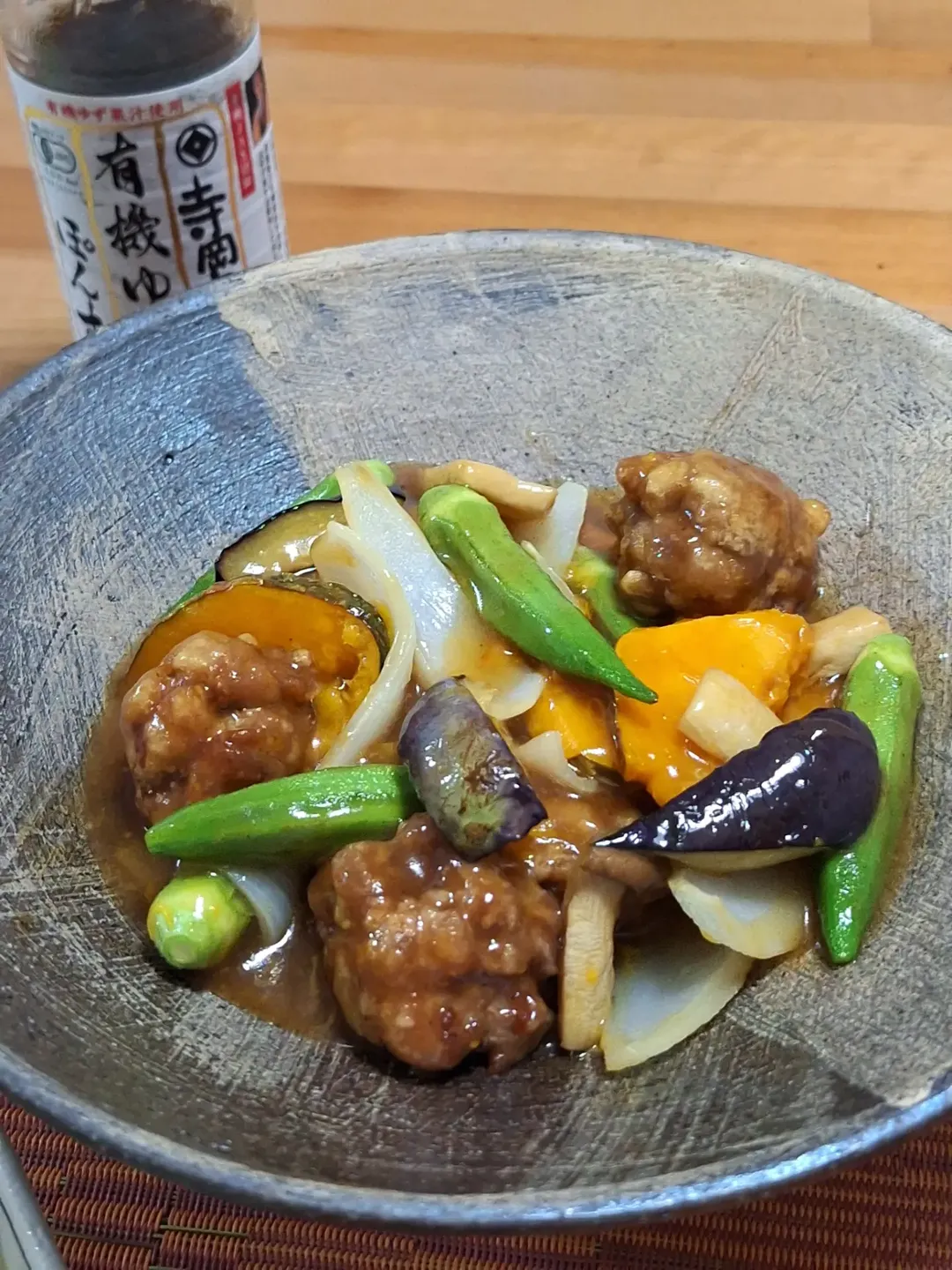 . 本当は鶏肉で作りたかったのですが、豚塊肉でもなく、有り合わせの豚小間切肉で😅 【秋野菜と豚肉のぽん酢あんかけ】1人分 ◆材料◆ 豚小間切肉 100g 茄子 1/2本 かぼちゃ おくら 5~6本 玉葱 1/6個 エリンギ 1本 A.醤油、酒 各小さじ1 A.片栗粉 適量 B.寺岡家の有機ゆずぽんず 大さじ3 B.水 100cc B.片栗粉 大さじ1/2 揚げ油 適量 ◆作り方◆ ➀豚肉はAの醤油と酒を揉み込んで5等分にして丸める ②茄子は乱切り、かぼちゃは薄切り、玉葱はくし切り、おくらはガクを削り取り、エリンギは長さを半分に切って上は縦に4等分、下は4等分の薄切りにする ③中華鍋に油を熱し、➀にAの片栗粉をまぶして ぎゅっと握り、揚げる ④②も順番にさっと揚げて油をきる ➄Bを器に入れて混ぜ合わせておく ⑥中華鍋の油を片付けて、③④を戻し入れて➄を加えてとろみがつけば火を止める ぽん酢あんでさっぱりと☺️ ぽんずだけでは酸味が強すぎると思う方は、お好みでBに砂糖をプラスして甘酢あんにしても美味しいですよ👍 小間切肉を使うメリットは、火を通しすぎてかたくなったりパサつくこともなく、食べやすいことかな😊 冷めても柔らかいので、お弁当にも◎ 今回の野菜は、全て実家の家庭菜園から😆 その時々でぜひ季節の旬のものを加えてください💓 この日は、豚肉や野菜を素揚げにするついでに、もう一品!小海老の天ぷらもね😁 小海老の天ぷらには花椒塩を添えてます @teraoka_soy_sauce #PR #寺岡家 #寺岡有機醸造 #有機ゆずぽん酢 #寺岡家のぽん酢 #寺岡家のお醤油 #オーガニック調味料 #有機醤油使用 #国産ゆず #有機JAS認証 #ゆずの香り #冷しゃぶにぴったり #豆腐に合う #サラダにおすすめ #貴重なゆず #おうちごはん #調味料マニア #monipla #teraokake_fan #簡単レシピ #簡単調理 #ポン酢レシピ #秋野菜と豚肉のぽん酢あんかけ #ビールのおつまみ #暮らしを楽しむ