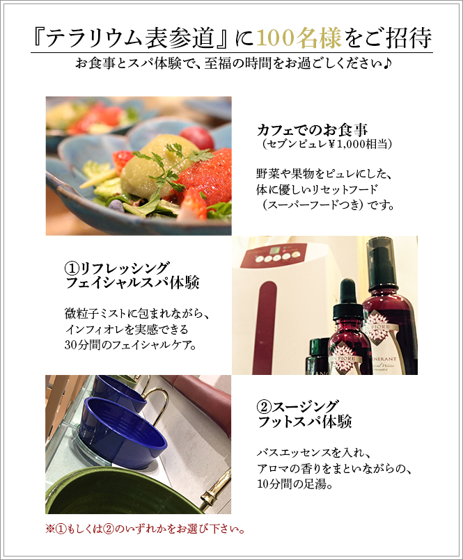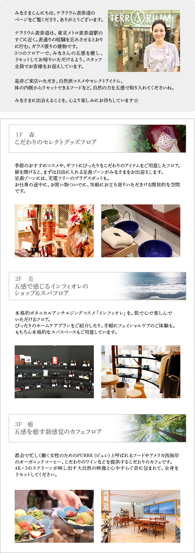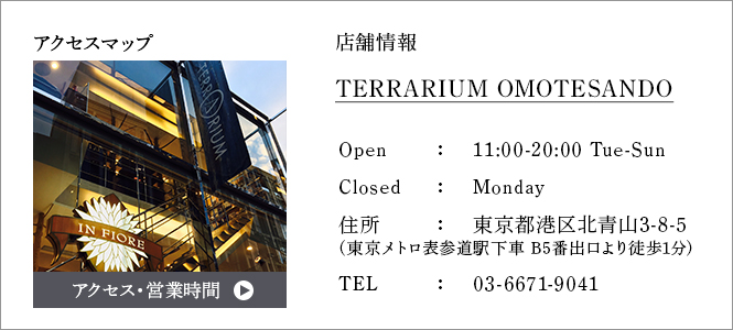 表参道にオープンした“ビューティ・ライフスタイル・ショップ"『テラリウム表参道』のファンサイトです! 美を思うすべての女性を、自然の力でつつみこみ、 五感で癒し浄化してくれる場所。 |