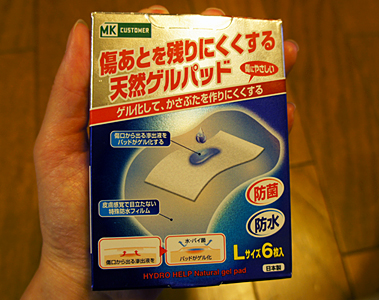 パッドの表面に天然高分子ゲルを塗工した新開発の救急絆創膏です。この製品のは、パッド表面の天然高分子ゲルが浸出液などの水分を保持し、キズ口を治癒に適した環境にし、かさぶたを作りにくくしする事で、傷跡を残りにくくします。