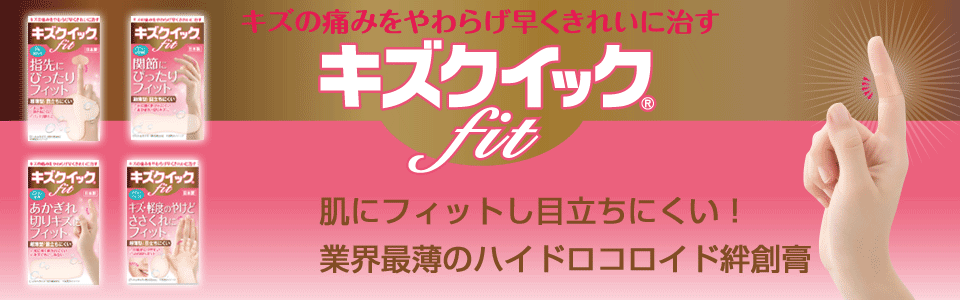 キズクイックfitは、キズの痛みをやわらげ早くきれいに治す ハイドロコロイドばんそうこうです。