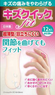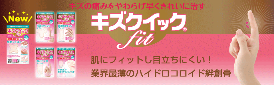 キズクイックfitは、キズの痛みをやわらげ早くきれいに治す ハイドロコロイドばんそうこうです。