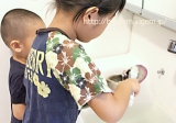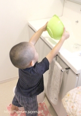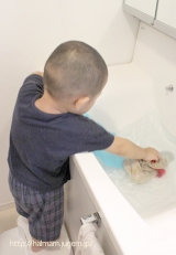 幼稚園の上履きを洗っているハル他の手伝いは言われなきゃしないけど、上履き洗いは毎週やってます (゚▽゚ノノ゙エライエライで、横で見てるマメも「やるー」と言ってお姉ちゃんのジャマばかりするのでとりあえず「順番!」と待たせてみます↓ ふてくされながら並んでるマメ(笑)そして、待ちに待ったボクの番… 2012/09/18
